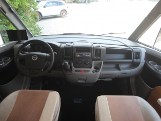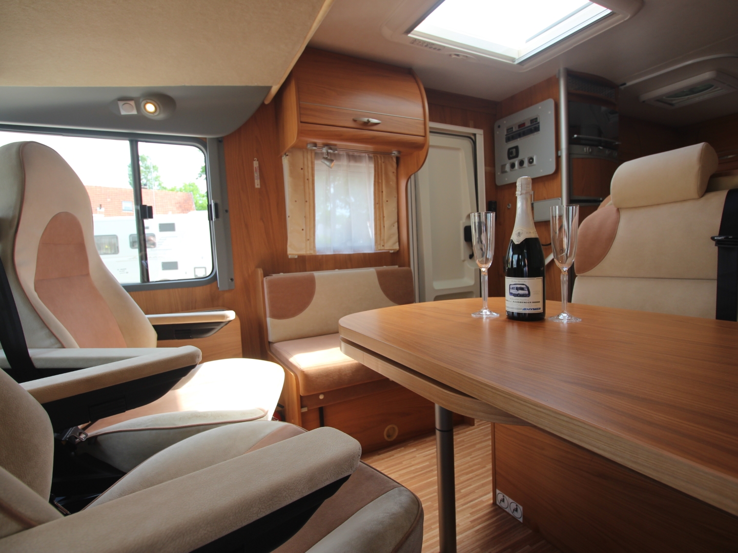 2 comfortabele pilotestoelen draaibaar naar gezellige zitgroep met lange zijbank. Het prachtige interieur bestaat uit sfeervol meubeldecor met mooie alcantara bekleding, wat met zijn vele sfeerverlichting een bijzonder mooi effect geeft. Het interieur heeft een volledig vlakke vloer. Alle ramen zijn voorzien van plissévouwverduistering.