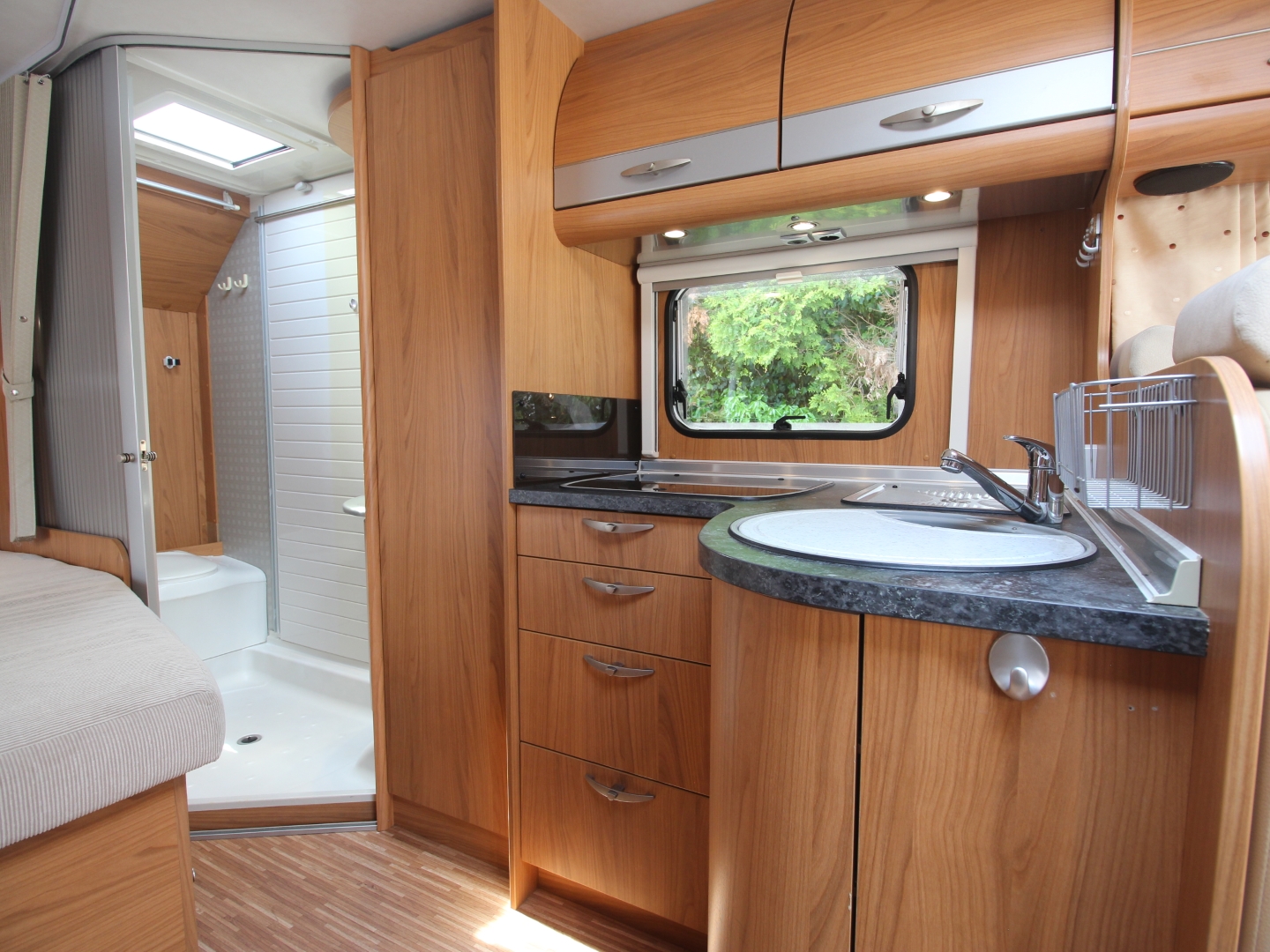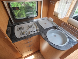 De ingangsdeur is voorzien van een schuifbare hordeur en een elektrisch en geïntegreerde opstap, de royale hoekkeuken bevat een spoelbak en 3 pits kooktoestel en diverse gelagerde laden met verrassend veel bergruimte voor het kookgerei en boodschappen, grote dubbeldeurs koelkast 160 ltr met aparte vriezer en volautomatische omschakeling van 220 Volt / 12 Volt / gas, inclusief een bakoven.