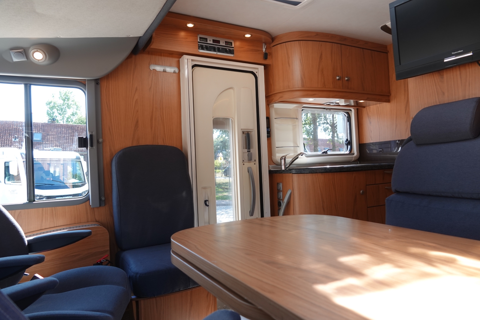 2 comfortabele pilotestoelen draaibaar naar gezellige zitgroep met zijbank. Het prachtige interieur bestaat uit sfeervol meubeldecor met mooie antraciet stoffen bekleding, wat met zijn vele sfeerverlichting een bijzonder mooi effect geeft. Het interieur heeft een volledig vlakke vloer. Binnen is het heerlijk koel te houden door de Truma Aventa dakairco. Alle ramen zijn voorzien van plissévouwverduistering.