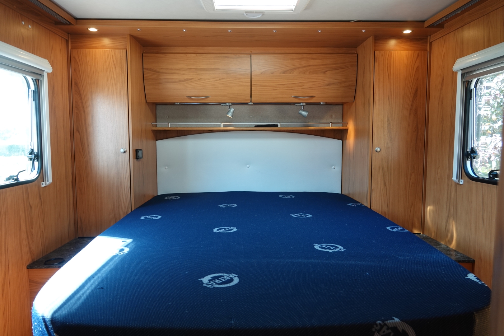 Het slaapgedeelte achter heeft een makkelijk toegankelijk queensbed (198 x 140 cm) met kastruimte eronder en een hangkast ernaast. Boven de cabine een ruim 2 persoons hefbed.