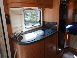 De ingangsdeur is voorzien van een schuifbare hordeur en een elektrisch en geïntegreerde opstap, de royale keuken bevat een spoelbak en 3 pits kooktoestel en diverse gelagerde laden met verrassend veel bergruimte voor het kookgerei en boodschappen, en grote Dometic TecTower koelkast met aparte vriezer en luxe bakoven en automatische energiekeuze.