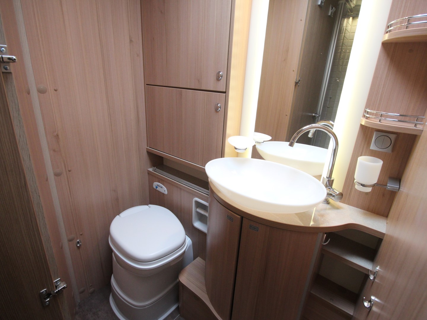 Links achterin bevind zich de ruime douchecabine, en er tegenover de ruime badkamer met Thetford toilet. De slaapkamer is dmv. een deur geheel af te sluiten en heeft 2 royale eenpersoons bedden met binnenveringsmatras op lattenbodem.