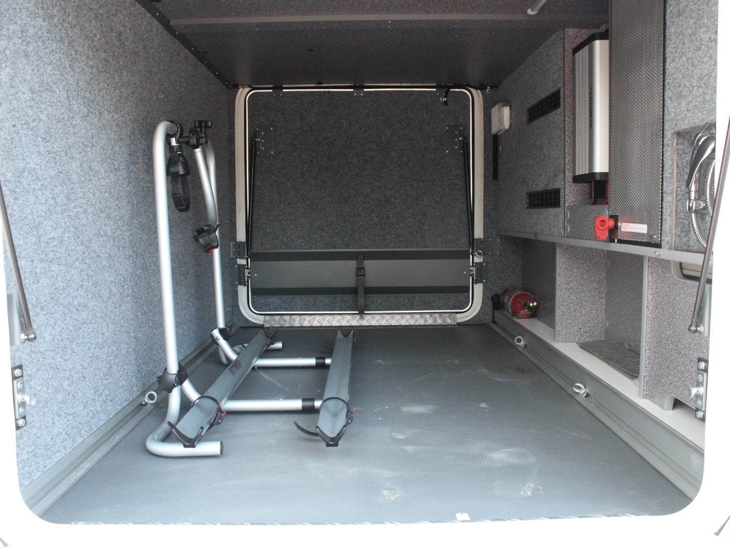 De camper heeft veel bergruimte in de ruime dubbele bodem bereikbaar dmv. verschillende luiken in de vloer en van buitenaf. Het bevat tevens een grote garage, met aan beide zijden een toegangsdeur, waarin uw fietsen en bagage veilig binnen geplaatst kunnen worden.