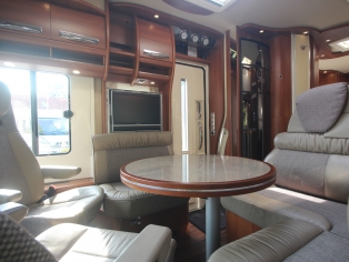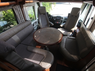 2 comfortabele Aguti Ergoflex pilotestoelen in hoogte verstelbaar en kantelbaar, draaibaar naar een gezellige comfort L-zit met luxe salontafel en zijbank. Schitterende bovenkastjes in cabine waar u rechtop kunt staan. Het interieur bestaat uit het stijlvolle Carthago meubilair met de luxe leer/stof bekleding wat met de vele LED verlichting een bijzondere sfeer geeft.
