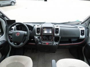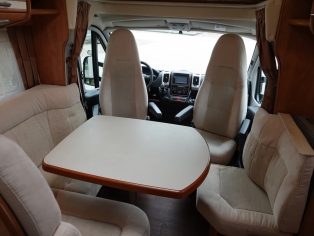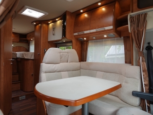 2 comfortabele cabinestoelen, draaibaar naar gezellige en comfortabele zitgroep, met lange zijbank en een groot panoramadak erboven. Het interieur bestaat uit het Carthago woonruimte-concept in combinatie met chique stoffen bekleding, wat met de vele LED sfeer-verlichting een bijzonder mooi effect geeft. Alle ramen zijn voorzien van plissévouwverduistering.