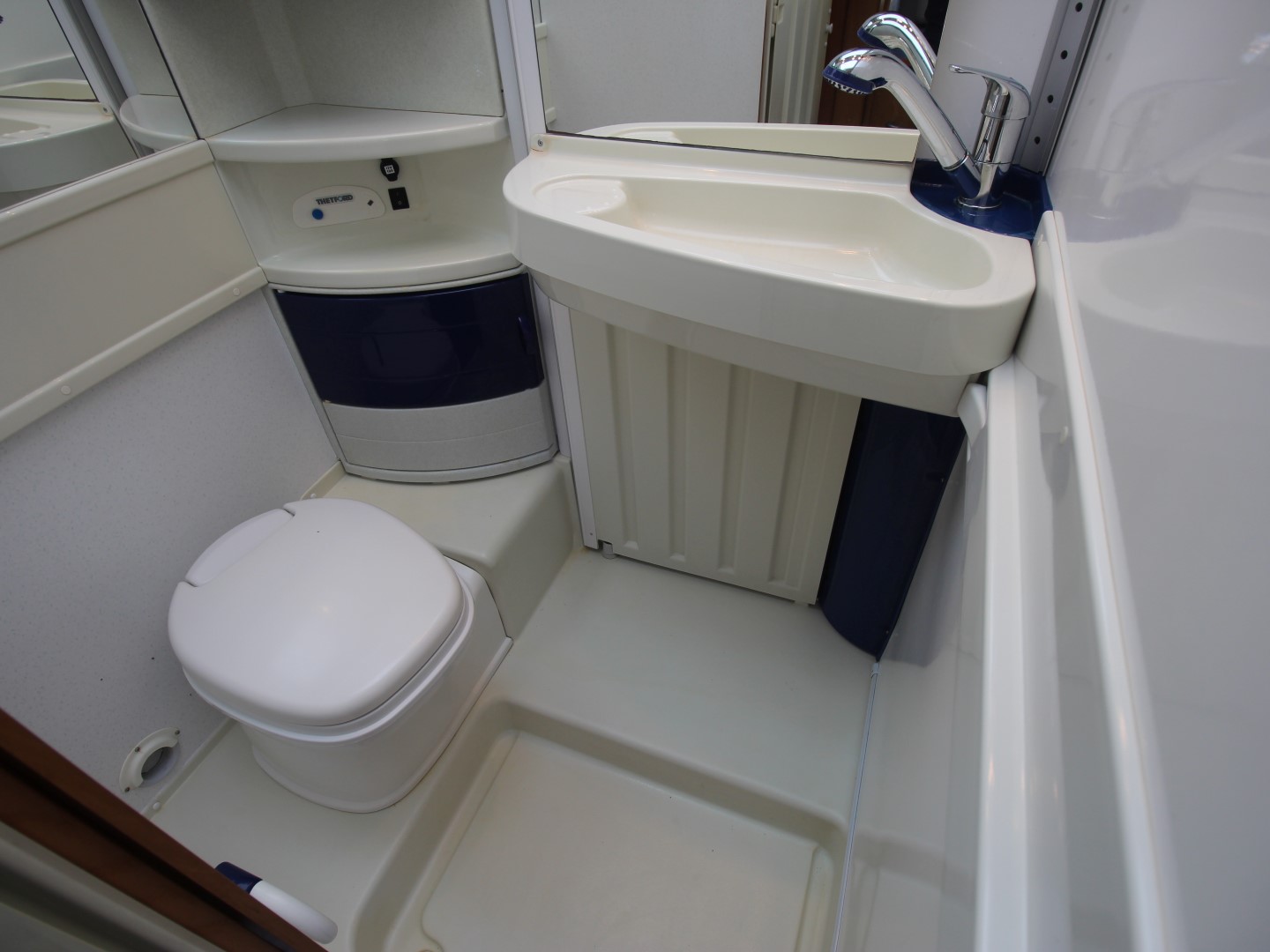 De ruime badkamer met wastafel heeft een Thetford toilet, en een aparte grote douchecabine.
