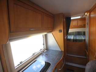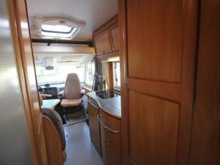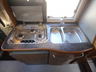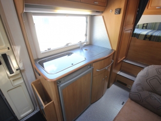 De comfort ingangsdeur is voorzien van een hordeur en een elektrisch en geïntegreerde opstap. De royale keuken bevat een spoelbak en 3 pits kooktoestel met ontstekingsautomaat, afzuigkap, diverse gelagerde laden met verrassend veel bergruimte voor het kookgerei en boodschappen, en ruime koelkast met vriesvak.