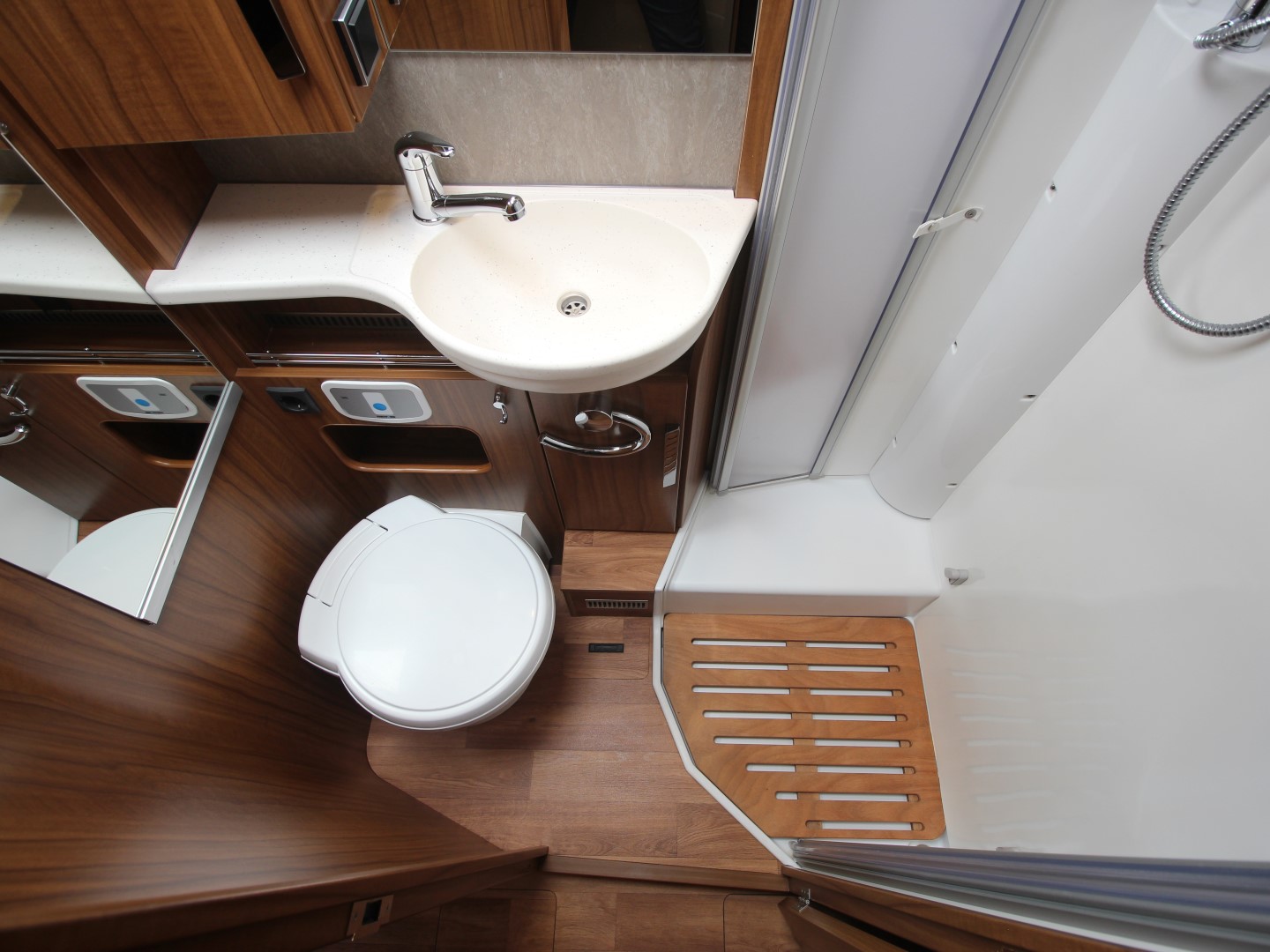 Luxe comfortabele badkamer met wastafel en Thetford toilet met extra kastruimte en ruime aparte douchecabine, SOG automatische toiletontluchting, de 160 ltr schoon - en 140 ltr vuilwatertank bevinden zich in de (verwarmde) dubbele vloer. De fietsen en bagage plaatst u in de grote garage, bereikbaar dmv. een grote deur links en rechts. Het dak is voorzien van het hagelbestendig GFK materiaal.