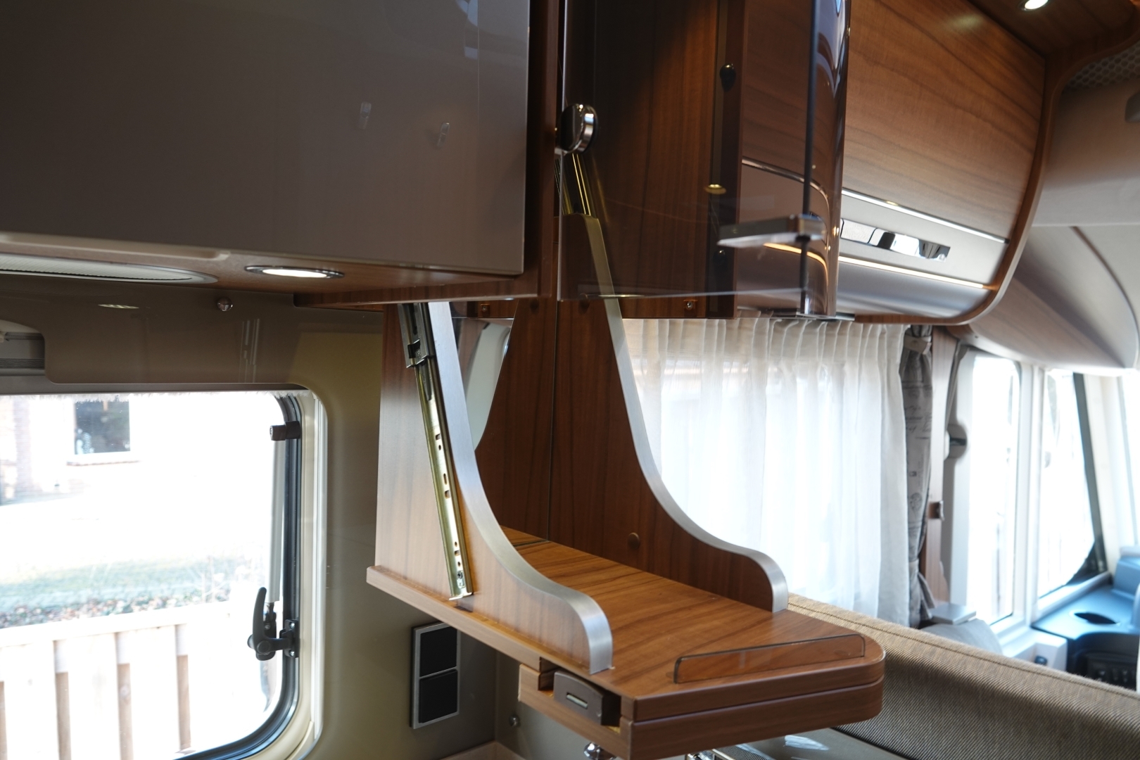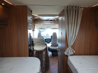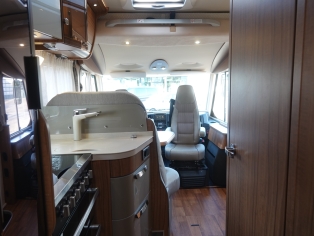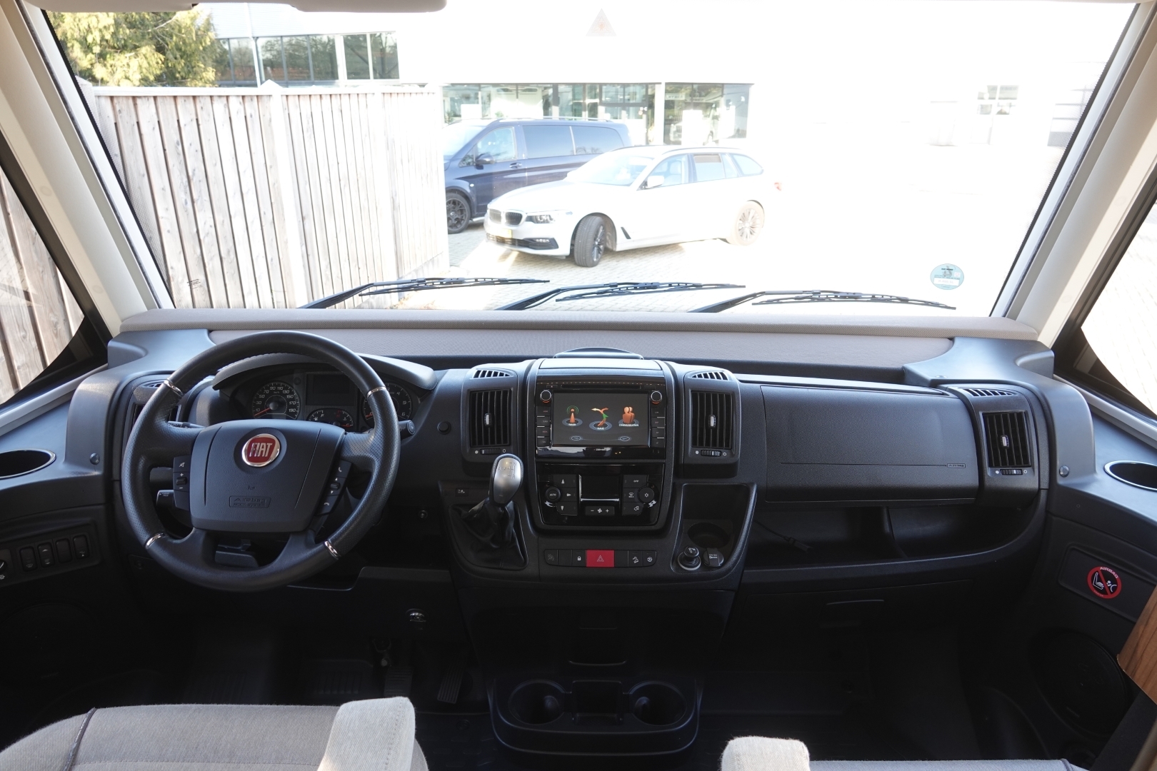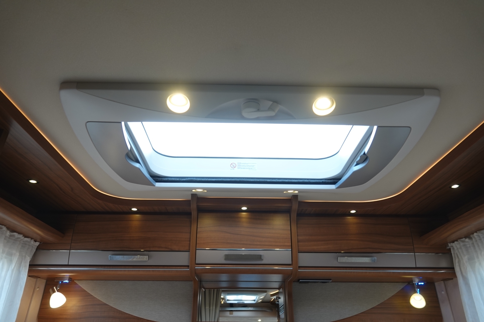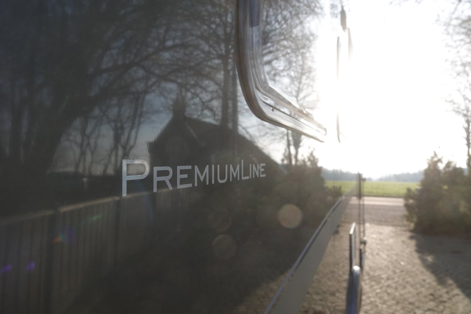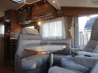 2 comfortabele in hoogte verstelbare Aguti pilotestoelen, draaibaar naar een gezellig comfort L-zit met luxe salontafel. Het interieur bestaat uit exclusief meubeldecor 'Palatino Apfel' met unieke stijl Premium Line in combinatie met de luxe stofbekleding waarbij met de vele LED verlichting een bijzondere sfeer ontstaat. De extra brede comfort ingangs-deur is voorzien van een raam, schuifbare hor, en een dubbele elektrische opstap.