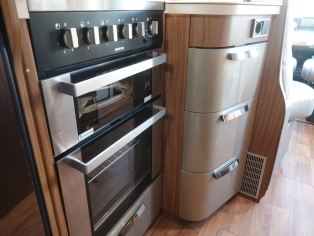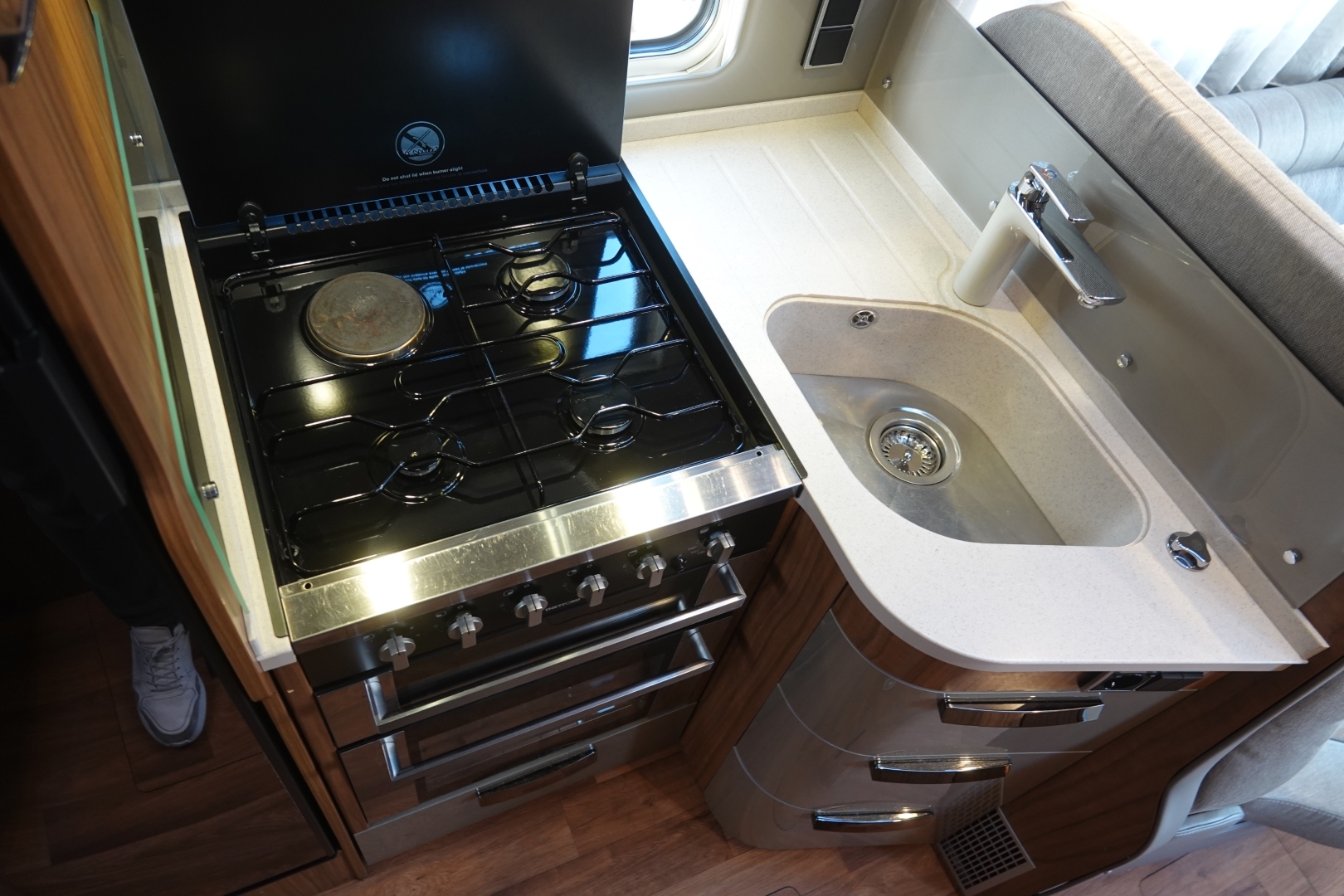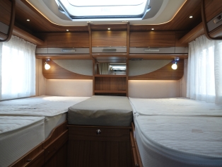 Het slaapgedeelte achter heeft 2 enkele bedden met het Hymer slaapcomfort systeem met koudschuim matras op schotelsysteem, ( om te leggen naar 1 groot bed) waaronder zich 2 ruime (hang)kasten bevinden. Bovenin de cabine een royaal 2 persoons hefbed. Dit betreft een Hymer B serie en bevat een dubbele bodem met veel extra bergruimte bereikbaar door diverse luiken in de vloer. De camper is voorzien van het Truma Plus Combi boiler/verwarmingssysteem met ringverwarming. De royale hoekkeuken bevat een blad uit mineraalstof, spoelbak en 3 pits kooktoestel met oven, diverse gelagerde laden met verrassend veel bergruimte voor kookgerei en boodschappen, en koelkast Smart Tower 142 L met vriesvak.