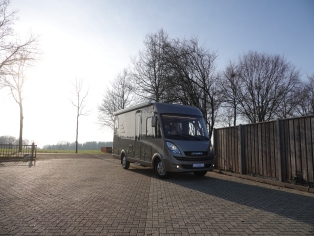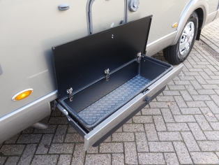 Luxe comfortabele badkamer met wastafel en Thetford toilet met extra kastruimte en ruime aparte douchecabine, de 160 ltr schoon - en 140 ltr vuilwatertank bevinden zich in de (verwarmde) dubbele vloer. De fietsen en bagage plaatst u in de grote garage, bereikbaar dmv. een grote deur links en rechts. Het dak is voorzien van het hagelbestendig GFK materiaal.