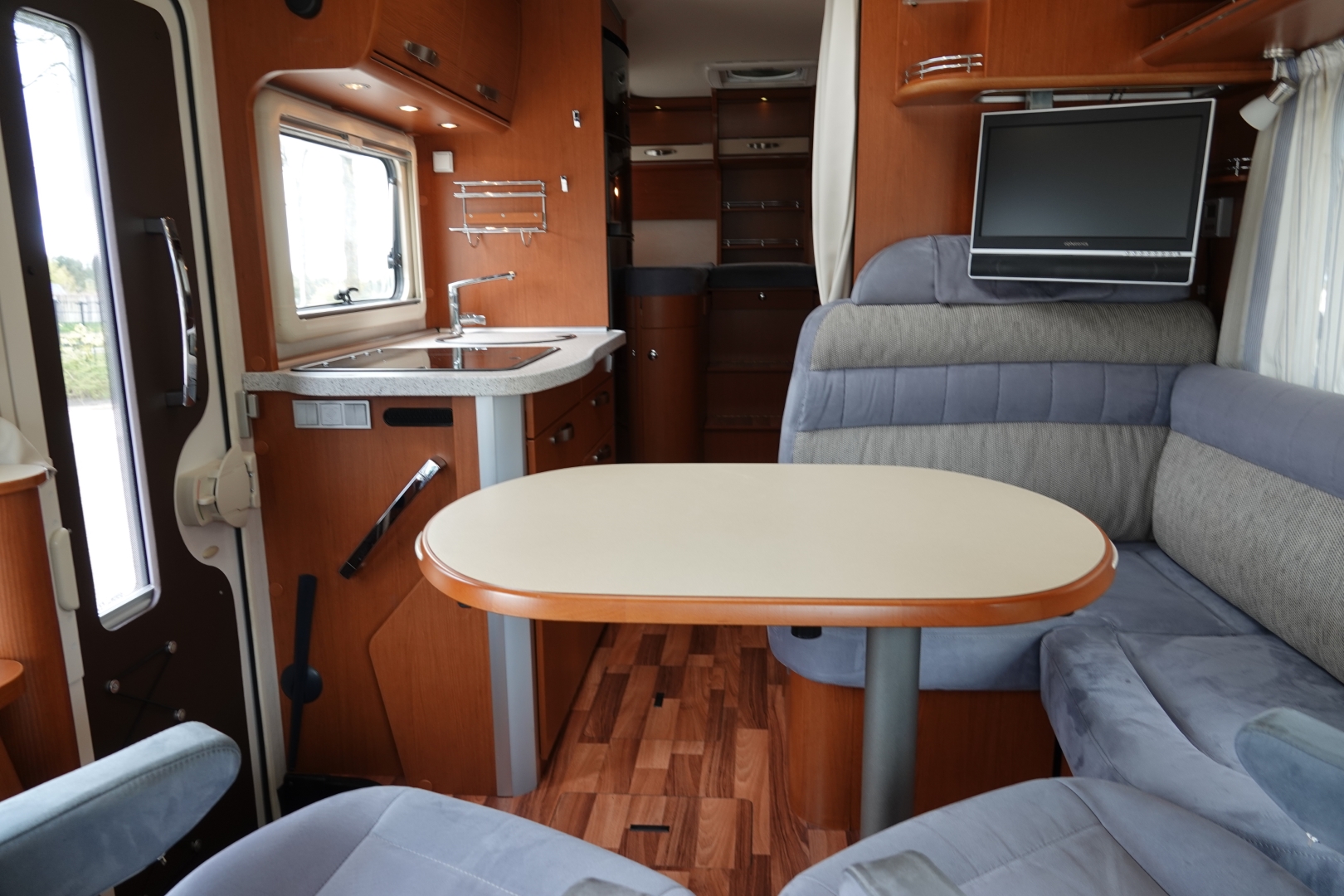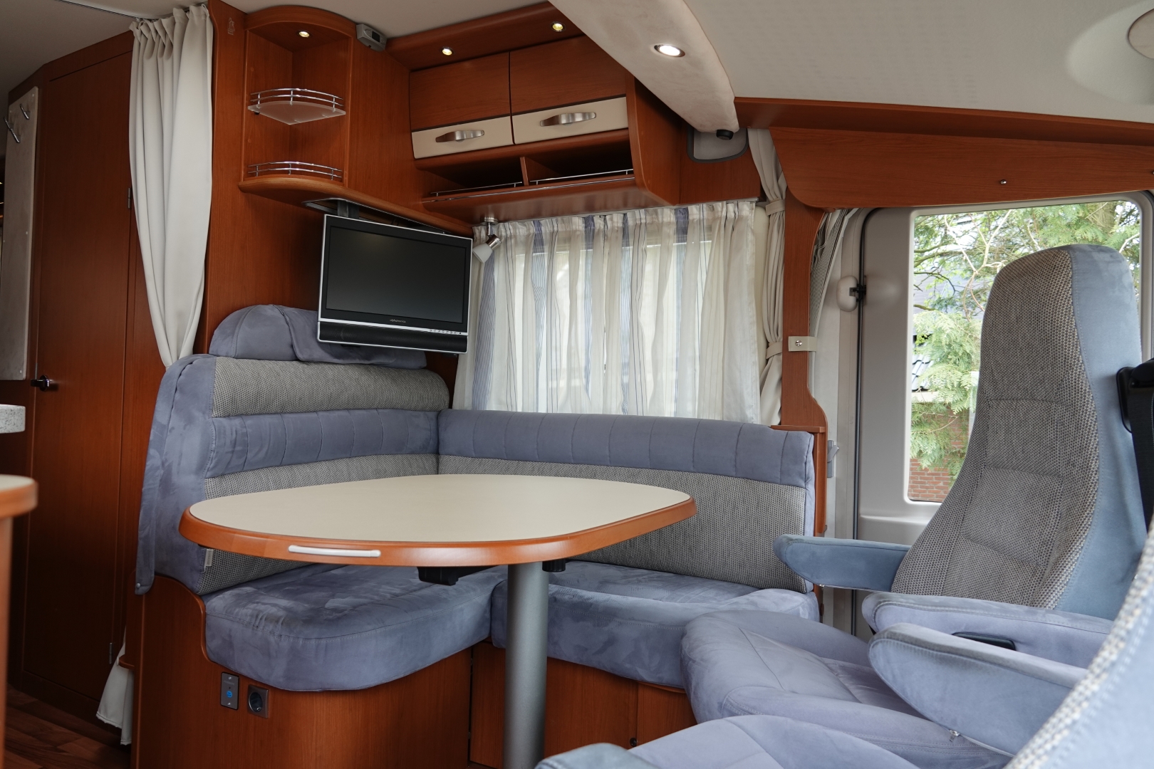 2 comfortabele Aguti pilotestoelen, in hoogte verstelbaar en kantelbaar, draaibaar naar een gezellig comfort L-zit met luxe salontafel. Het interieur bestaat uit stijlvol Morello Select meubeldecor in combinatie met de luxe alcantara/stofbekleding waarbij met de vele LED verlichting een bijzondere sfeer ontstaat. Alle ramen voorzien van vouwverduistering met hoogwaardige plissé-stof.