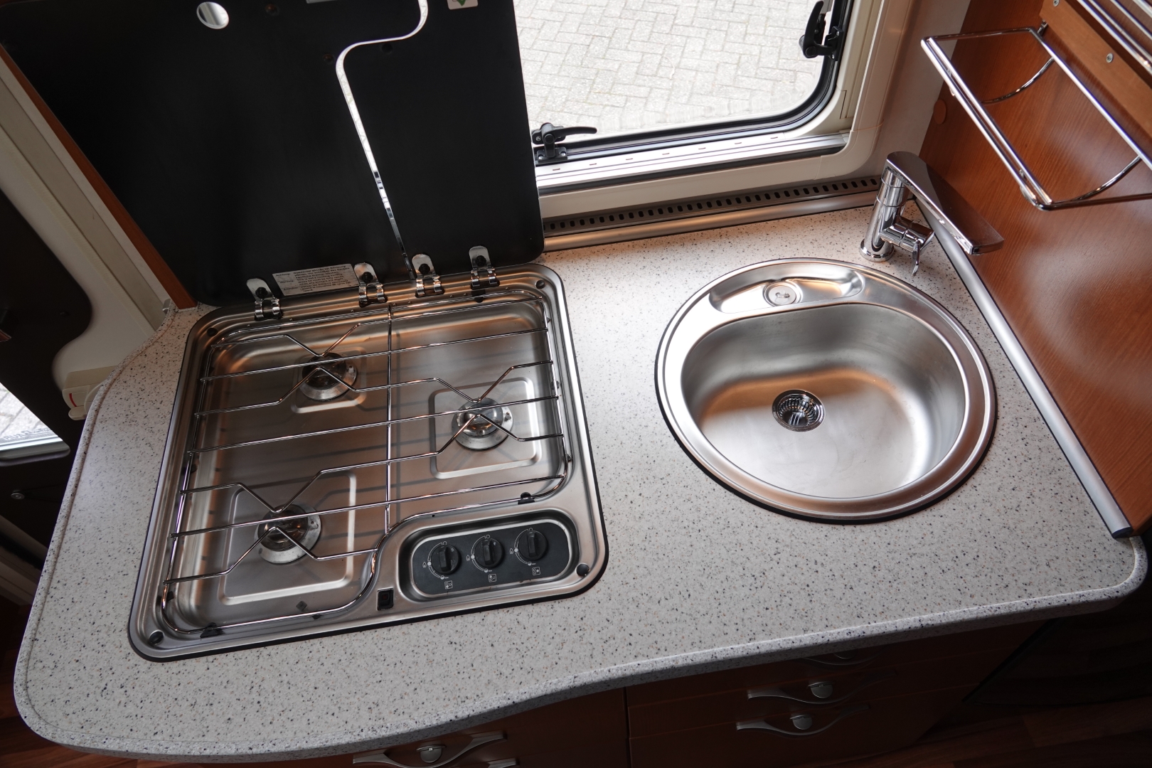 Het slaapgedeelte heeft 2 enkele bedden, met binnen-vering matras op lattenbodem, ( om te leggen naar 1 groot bed) waaronder zich 2 ruime (hang)kasten bevinden. Boven de bedden is een Maxxfan dakventilator gemonteerd voor koelte tijdens warme nachten. Dit betreft een Hymer B Klasse en bevat een dubbele bodem met veel extra bergruimte bereikbaar door diverse luiken in de vloer. De camper is voorzien van Truma Combi 6 verwarming/boiler met ringverwarming. De royale keuken bevat een spoelbak en 3 pits kooktoestel, diverse gelagerde laden met verrassend veel bergruimte voor kookgerei en boodschappen, grote dubbeldeurs 160 L koelkast met aparte vriezer en luxe bakoven.