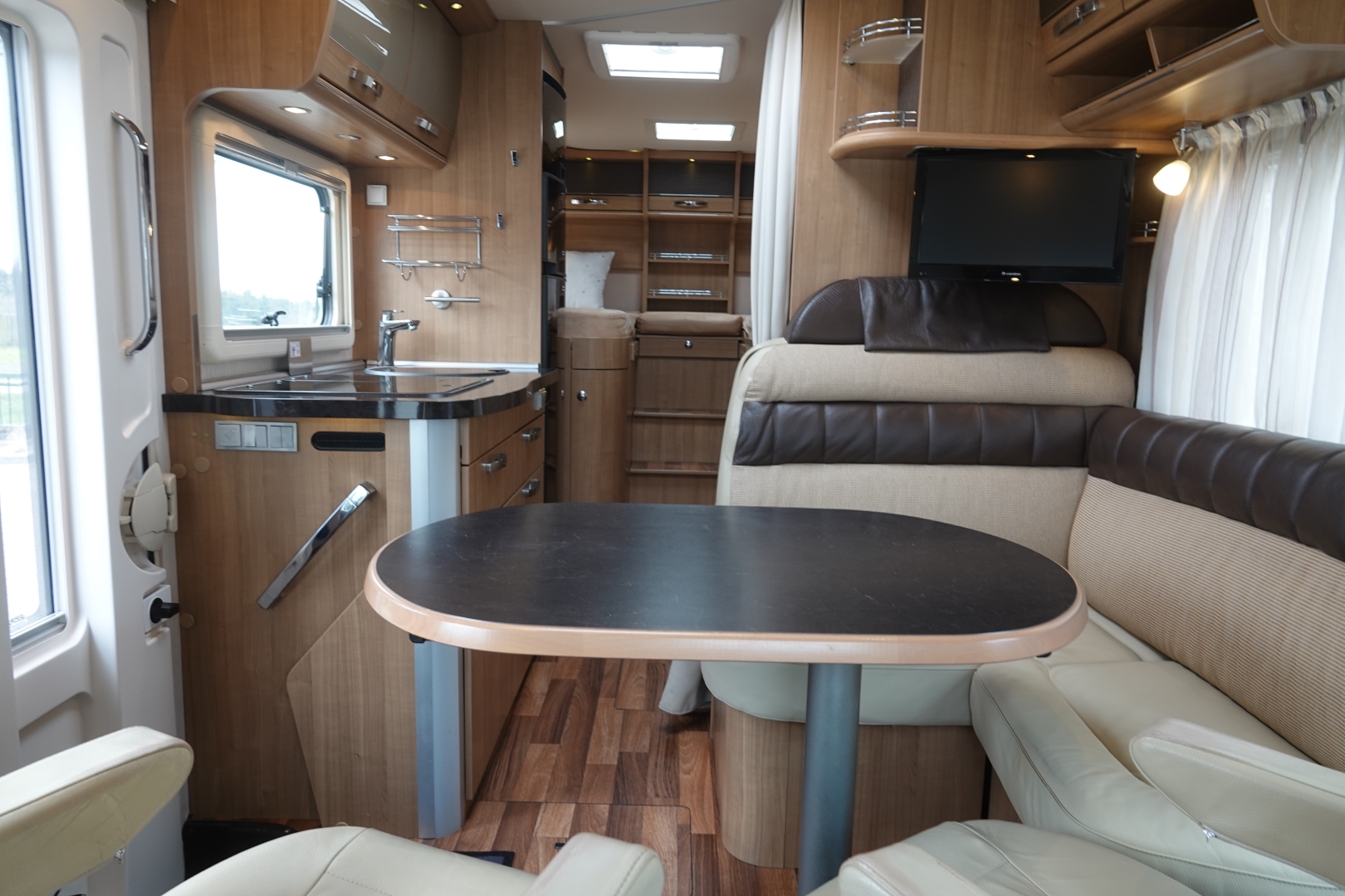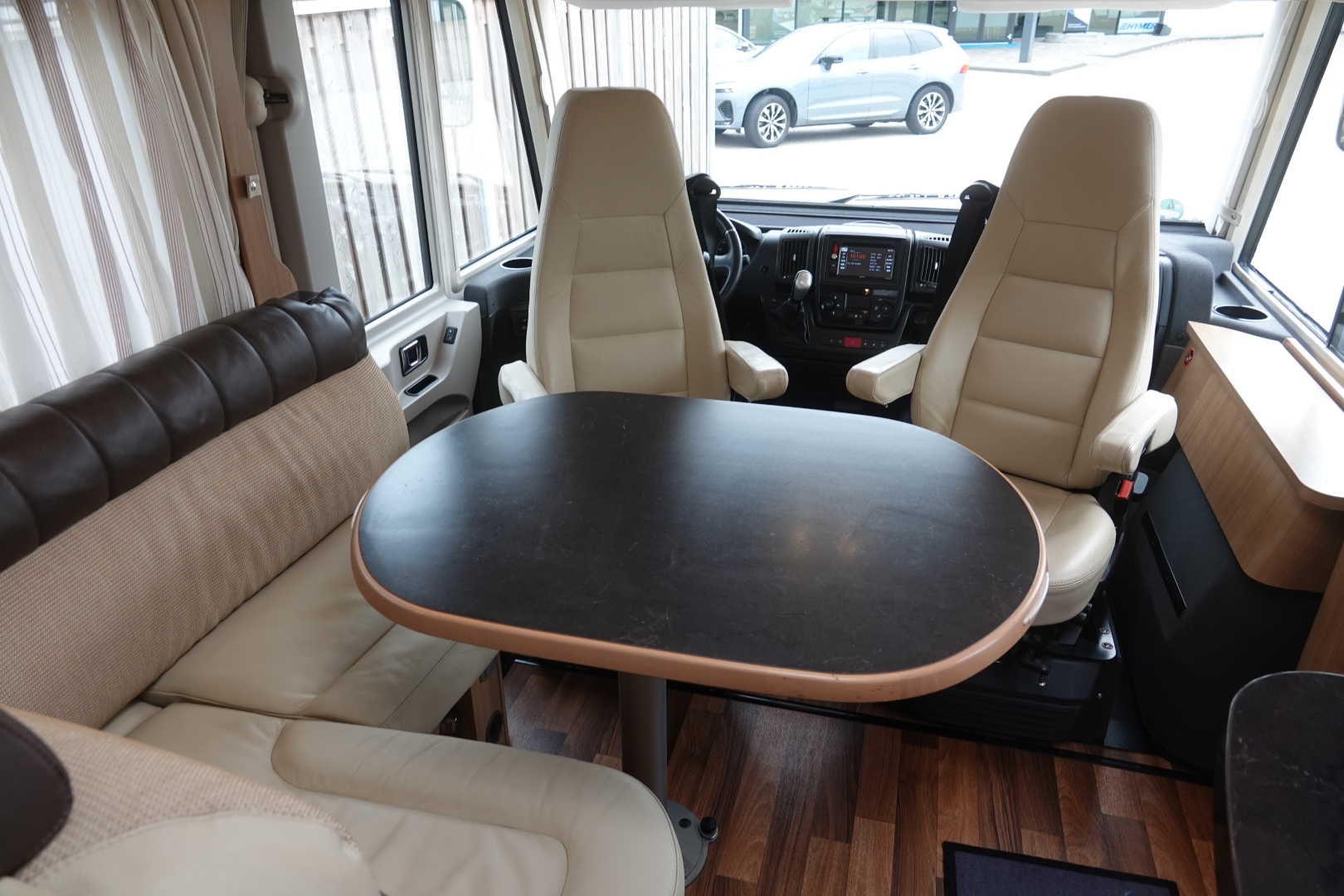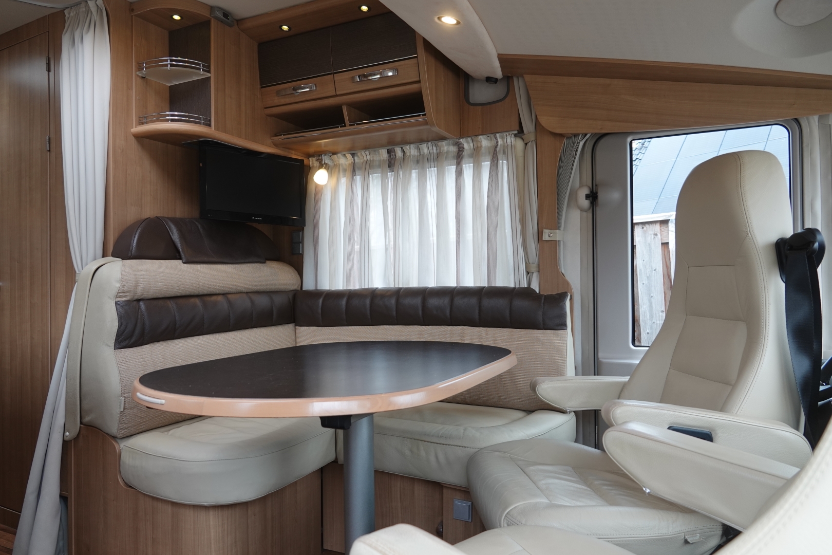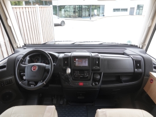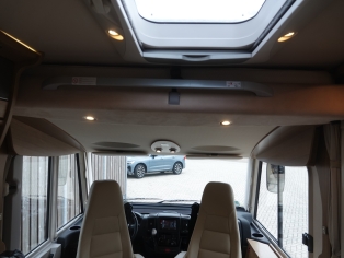 2 comfortabele, met leer beklede Aguti cabinestoelen, draaibaar naar een gezellig comfort L-zit met luxe salontafel. Het interieur bestaat uit stijlvol Umbria Select meubeldecor in combinatie met de luxe Trinidad stofbekleding met lederinleg waarbij met de vele LED verlichting een bijzondere sfeer ontstaat. Alle ramen voorzien van vouwverduistering met hoogwaardige plissé-stof.