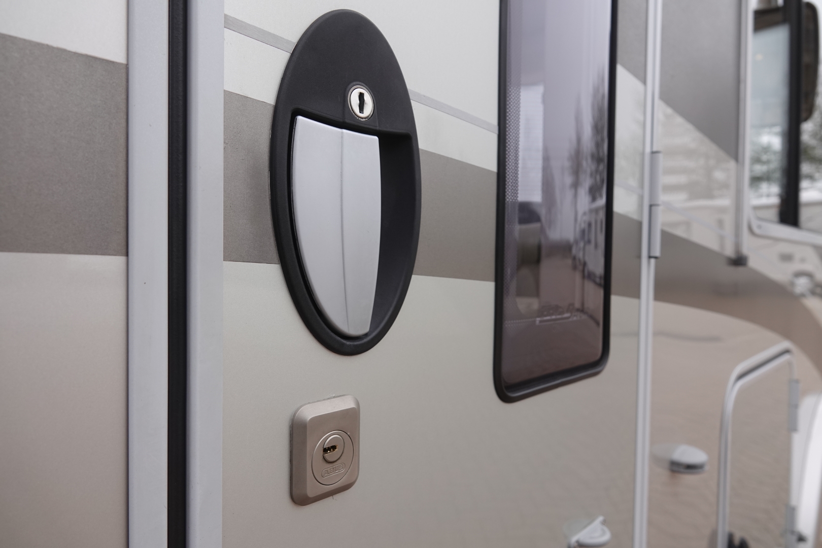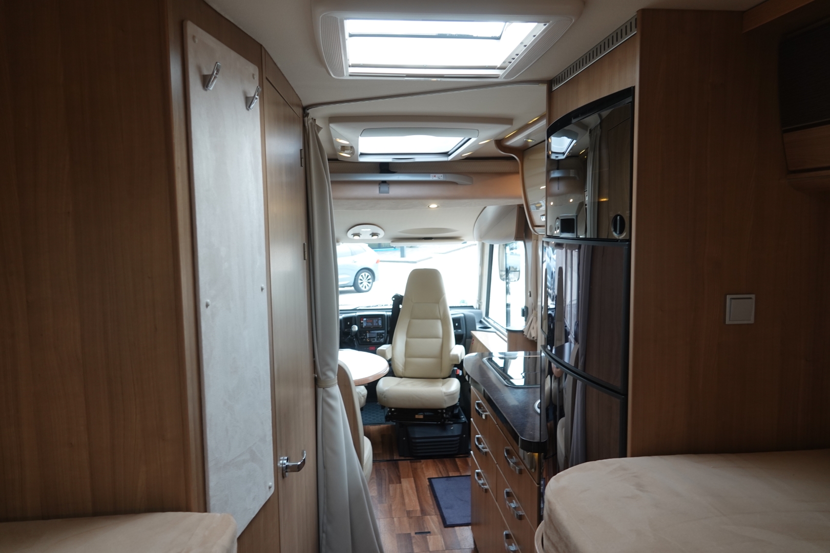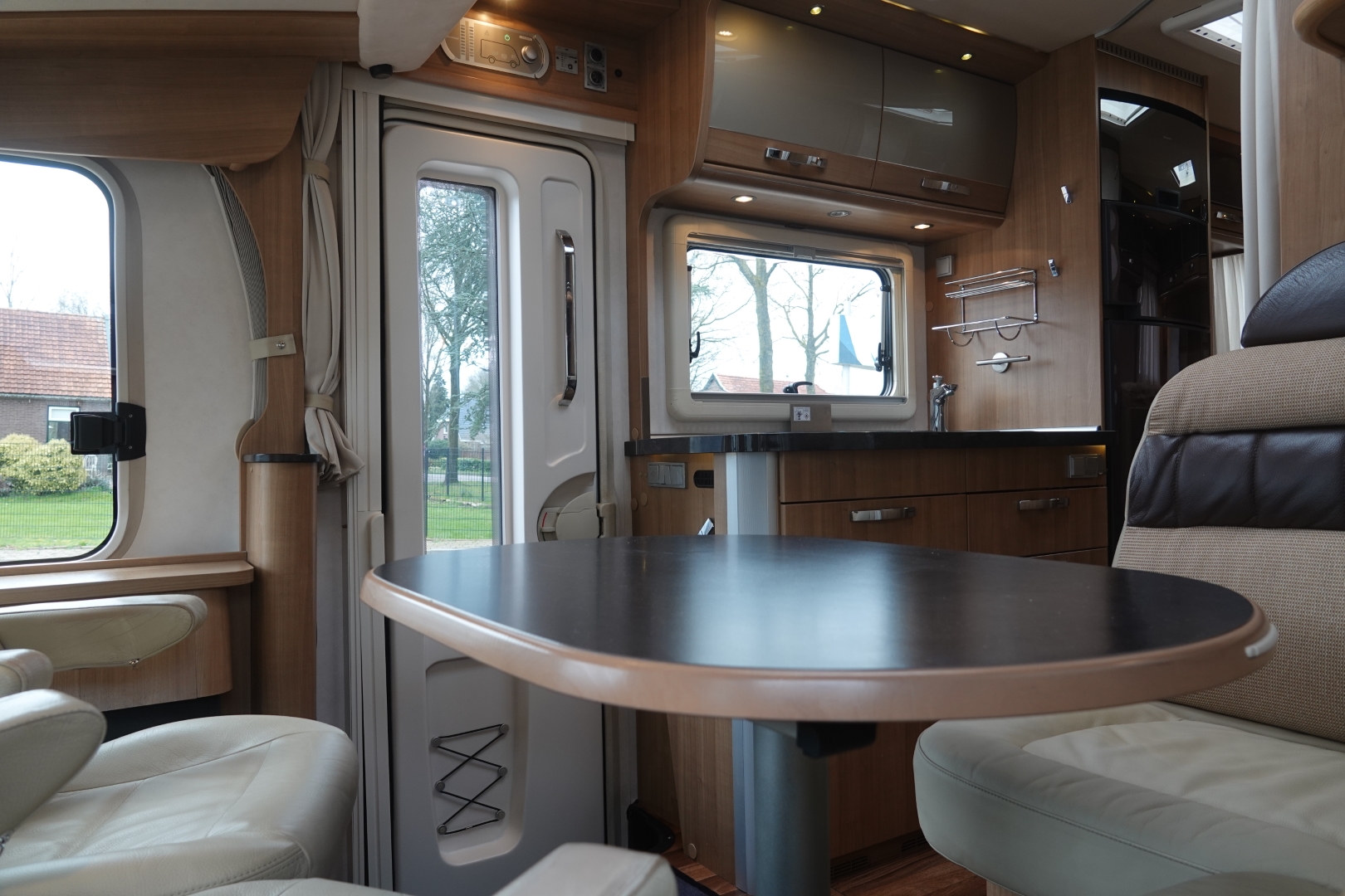2 comfortabele, met leer beklede Aguti cabinestoelen, draaibaar naar een gezellig comfort L-zit met luxe salontafel. Het interieur bestaat uit stijlvol Umbria Select meubeldecor in combinatie met de luxe Trinidad stofbekleding met lederinleg waarbij met de vele LED verlichting een bijzondere sfeer ontstaat. Alle ramen voorzien van vouwverduistering met hoogwaardige plissé-stof.