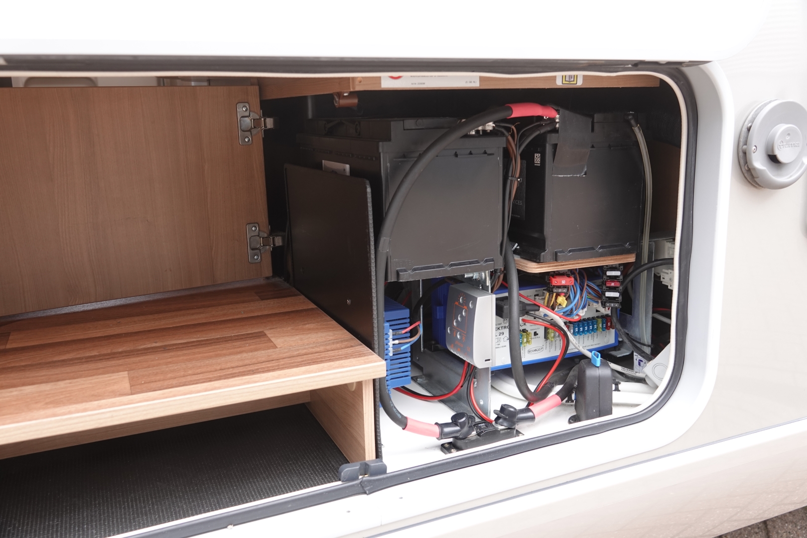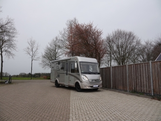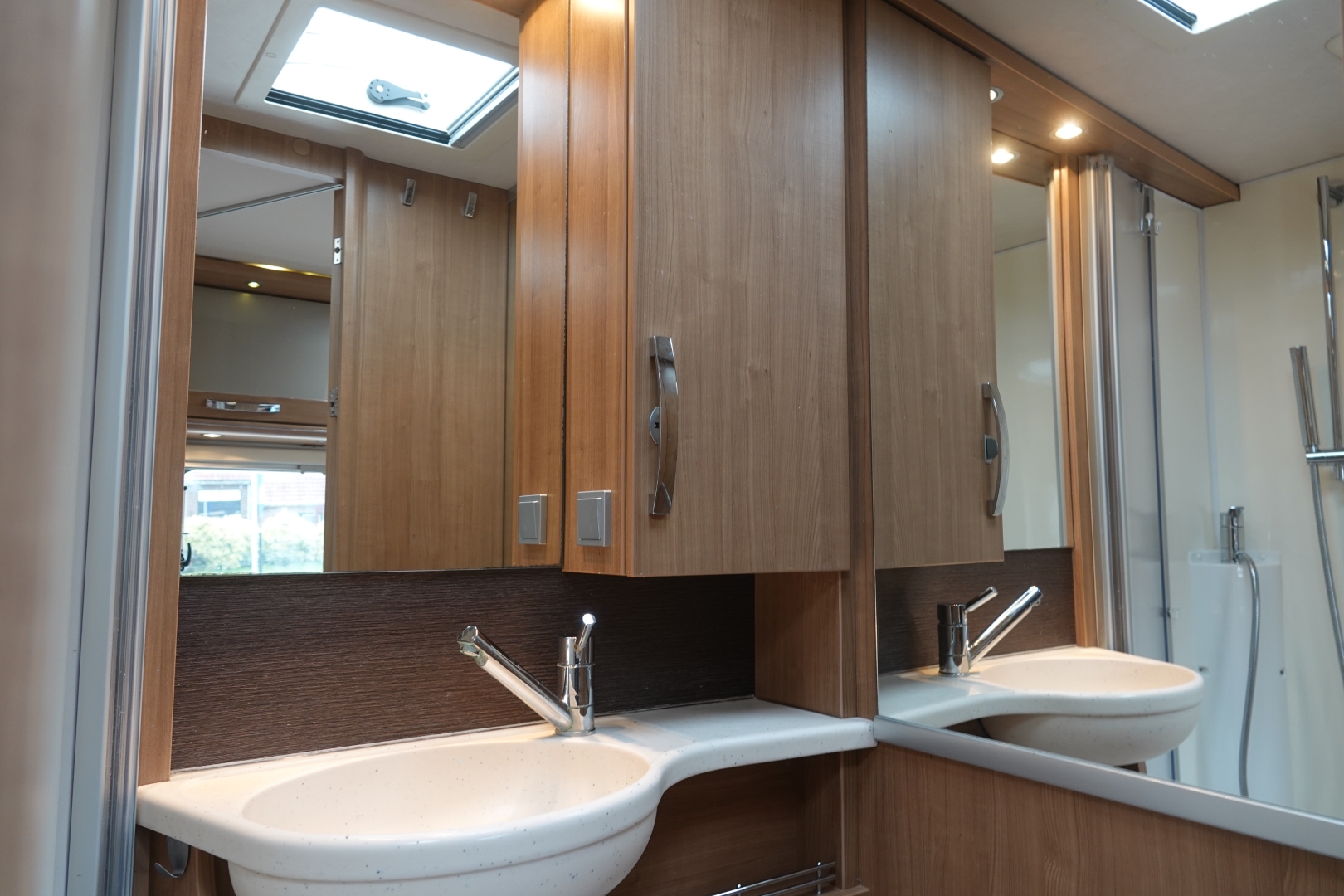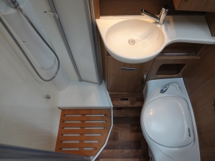 Luxe comfortabele badkamer met wastafel en Thetford toilet met extra kastruimte en ruime aparte douchecabine, de 120 ltr schoon - en 100 ltr vuilwatertank bevinden zich in de (verwarmde) dubbele vloer. Voor uw bagage is er ruimschoots ruimte in de grote garage, bereikbaar dmv. een grote deur links en rechts.