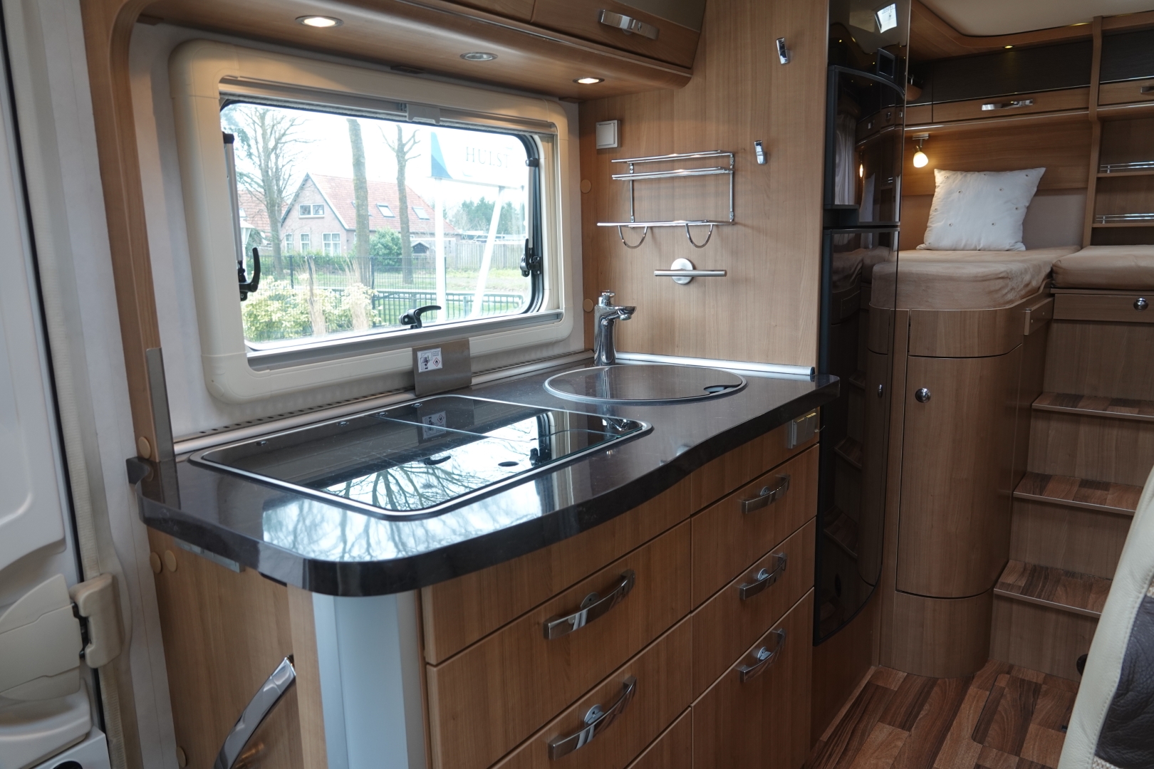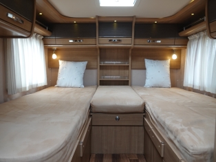 Het slaapgedeelte heeft 2 enkele bedden, met binnen-vering matras op lattenbodem, ( om te leggen naar 1 groot bed) waaronder zich 2 ruime (hang)kasten bevinden. In de cabine is een royaal 2 persoons hefbed. Dit betreft een Hymer B Klasse en bevat een dubbele bodem met veel extra bergruimte bereikbaar door diverse luiken in de vloer. De camper is voorzien van de comfortabele Truma Combi boiler/verwarming met gas of elektra als energiekeuze . De royale keuken bevat een spoelbak en 3 pits kooktoestel, diverse gelagerde laden met verrassend veel bergruimte voor kookgerei en boodschappen, grote dubbeldeurs 160 L koelkast met aparte vriezer en luxe bakoven.