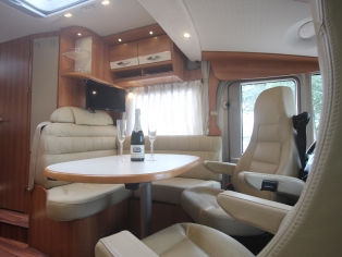 De 2 met leer beklede comfortabele pilotestoelen zijn draaibaar naar een ruime en gezellige comfort L-zit met luxe salontafel. Het sfeervolle interieur bestaat uit Hymer 'Morello Select' meubeldesign met de chique Hymer leder Kiesel bekleding aangevuld met sfeervolle LED verlichting. Alle ramen zijn voorzien van vouwverduistering van hoogwaardige plissé-stof.