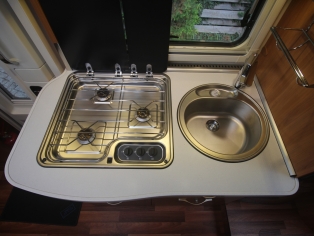 De ruime keuken is voorzien van 3 pits kooktoestel met ontstekingsautomaat, diverse gelagerde laden met verrassend veel bergruimte voor het kookgerei en boodschappen, grote dubbeldeurs koelkast 150 ltr met aparte vriezer en volautomatische omschakeling van 220 V/ 12 V/ gas.