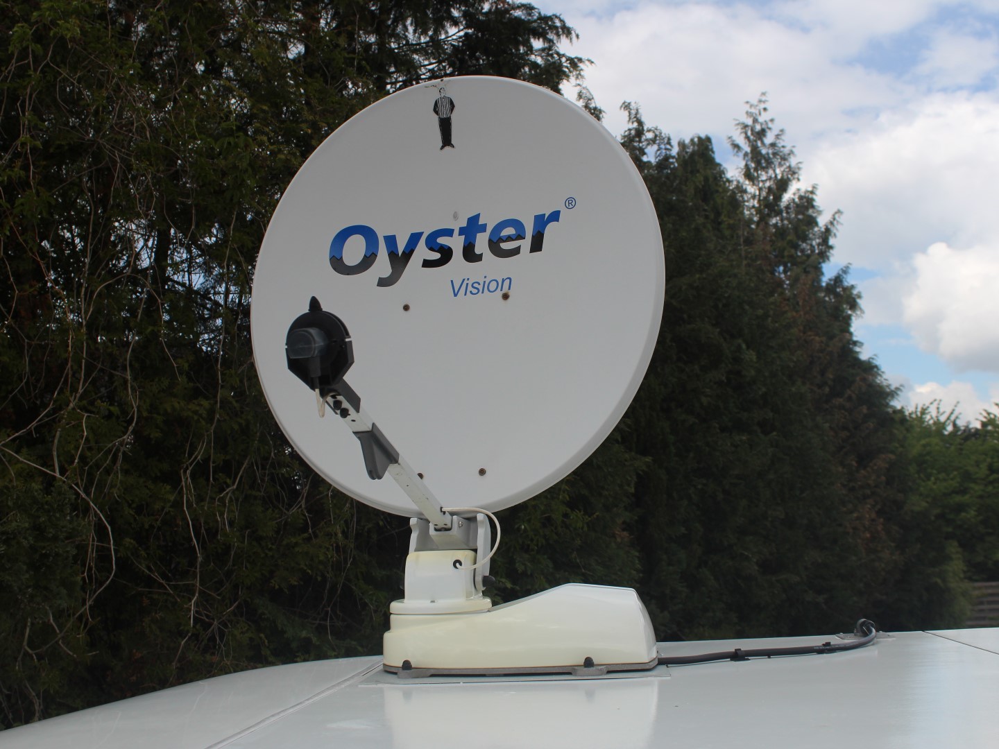 Televisie kijken kunt u dmv. een automatische satellietschotel Oyster 85 Vision met HD receiver en 19 inch LED TV.