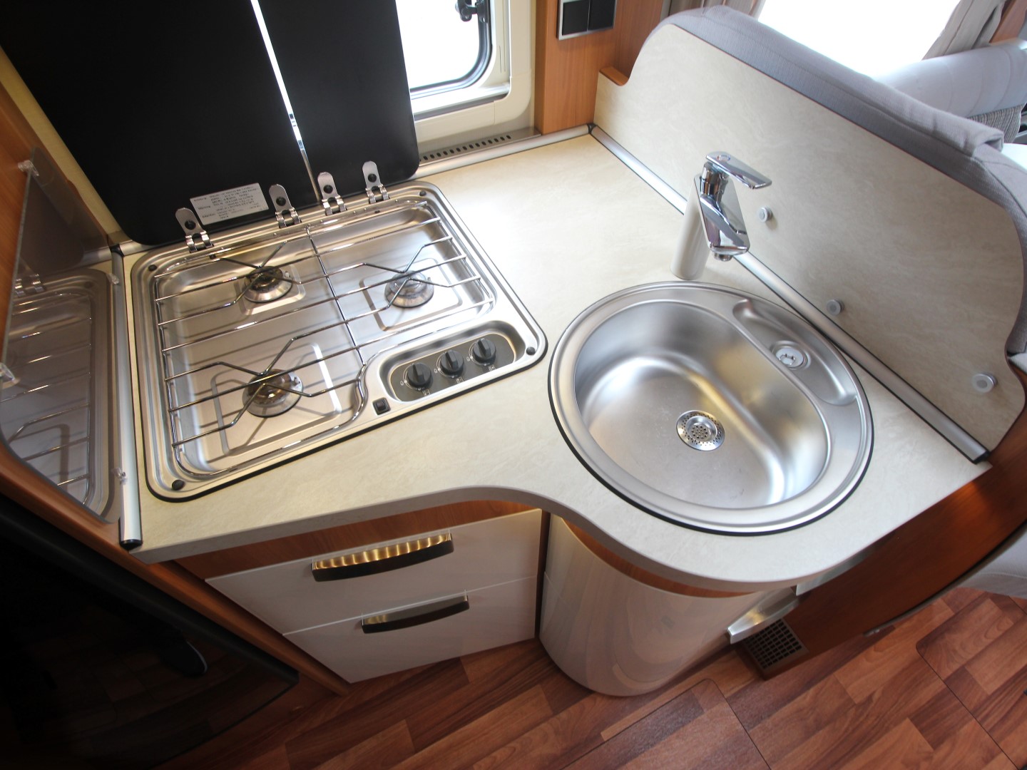 Het slaapgedeelte heeft 2 enkele bedden met het Hymer slaapcomfort systeem met koudschuimmatras op schotelbodem, ( om te leggen naar 1 groot bed) waaronder zich 2 ruime hangkasten bevinden. Boven in de cabine een royaal 2 persoons hefbed. Dit betreft een Hymer B serie en bevat een dubbele bodem met veel extra bergruimte bereikbaar door diverse luiken in de vloer. De camper is voorzien van Truma Combi 6 verwarming/boiler met ringverwarming. De royale hoekkeuken bevat een spoelbak en 3 pits kooktoestel, diverse gelagerde laden met verrassend veel bergruimte voor kookgerei en boodschappen, en grote Dometic koelkast Tec Tower met aparte vriezer en luxe oven.