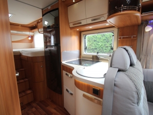 2 comfortabele in hoogte verstelbare Aguti pilotestoelen, draaibaar naar een gezellig comfort L-zit met luxe salontafel. Het interieur bestaat uit sfeervol meubeldecor Trentino Binbaum in combinatie met de luxe Montasio bekleding waarbij met de vele LED verlichting een bijzondere sfeer ontstaat. De comfort ingangs-deur is voorzien van een raam, schuifbare hor, en electrische opstap.