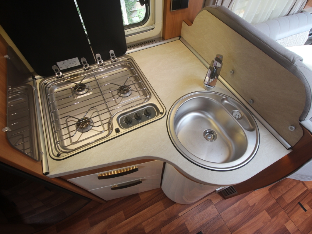 Het slaapgedeelte heeft 2 enkele bedden met het Hymer slaapcomfort systeem met koudschuimmatras op schotelbodem, ( om te leggen naar 1 groot bed) waaronder zich 2 ruime hangkasten bevinden. Boven in de cabine een royaal 2 persoons hefbed. Dit betreft een Hymer B serie en bevat een dubbele bodem met veel extra bergruimte bereikbaar door diverse luiken in de vloer. De camper is voorzien van Truma Combi 6 verwarming/boiler met ringverwarming. De royale hoekkeuken bevat een spoelbak en 3 pits kooktoestel, diverse gelagerde laden met verrassend veel bergruimte voor kookgerei en boodschappen, en grote Dometic koelkast Tec Tower met aparte vriezer en luxe oven.