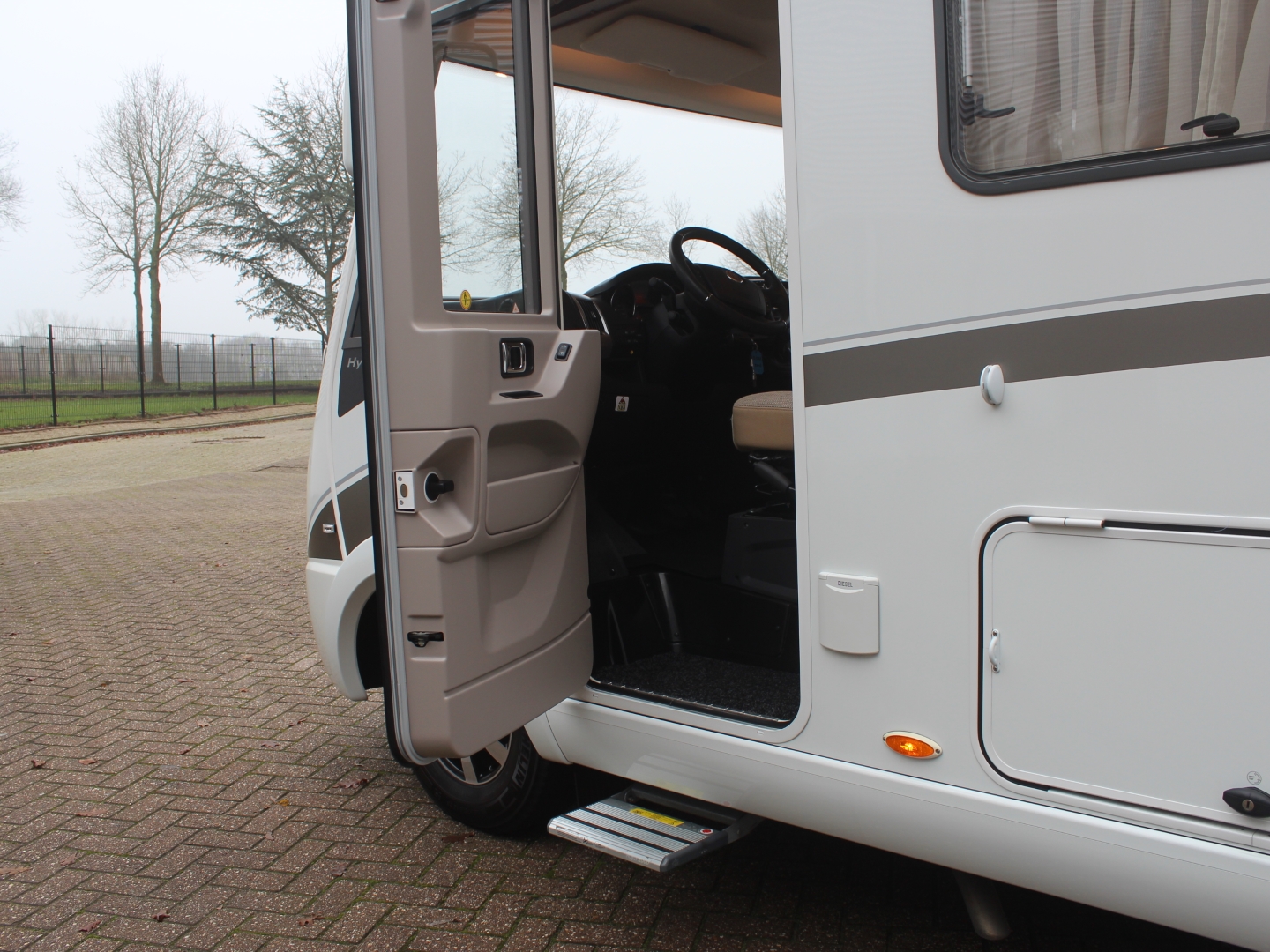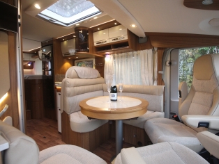 2 comfortabele in hoogte verstelbare Aguti pilotestoelen, draaibaar naar een gezellig comfort L-zit met luxe uitschuifbare salontafel. Het interieur bestaat uit sfeervol meubeldecor in combinatie met de luxe stof bekleding met leerinleg, waarbij met de vele LED verlichting een bijzondere sfeer ontstaat. De comfort ingangs-deur is voorzien van een raam, schuifbare hor, Abus veiligheidsslot en electrische opstap.