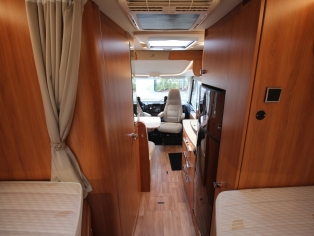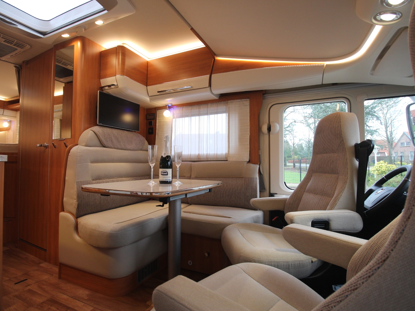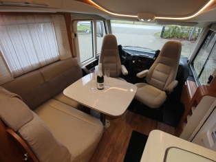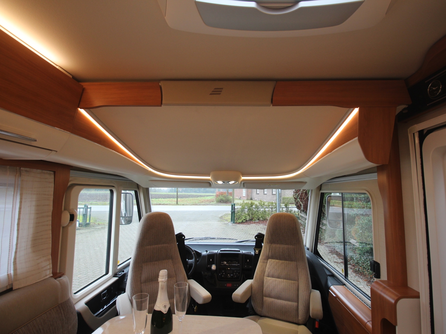2 comfortabele Aguti Ergoflex pilotenstoelen, in hoogte en helling instelbaar, draaibaar naar een gezellige en ruime comfort L-zit met luxe salontafel. Het interieur heeft een volledig vlakke vloer en bestaat uit het nieuwe lichtbouw-meubelgeneratie en het sierlijke meubeldesign Trentino Birnbaum, in combinatie met de luxe Pico bekleding en de vele LED verlichting geeft dit een bijzondere sfeer. Heerlijk koel te houden door de Dometic dakairco. Cabineramen zijn voorzien van vouw- verduistering van hoogwaardig plisséstof, en bij het voorraam een electrisch rolluik.
