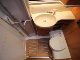 De nieuwe comfortabele badkamer heeft een volledig vlakke vloer en bied voldoende sta- en doucheruimte en is voorzien van wastafel en Thetford banktoilet.