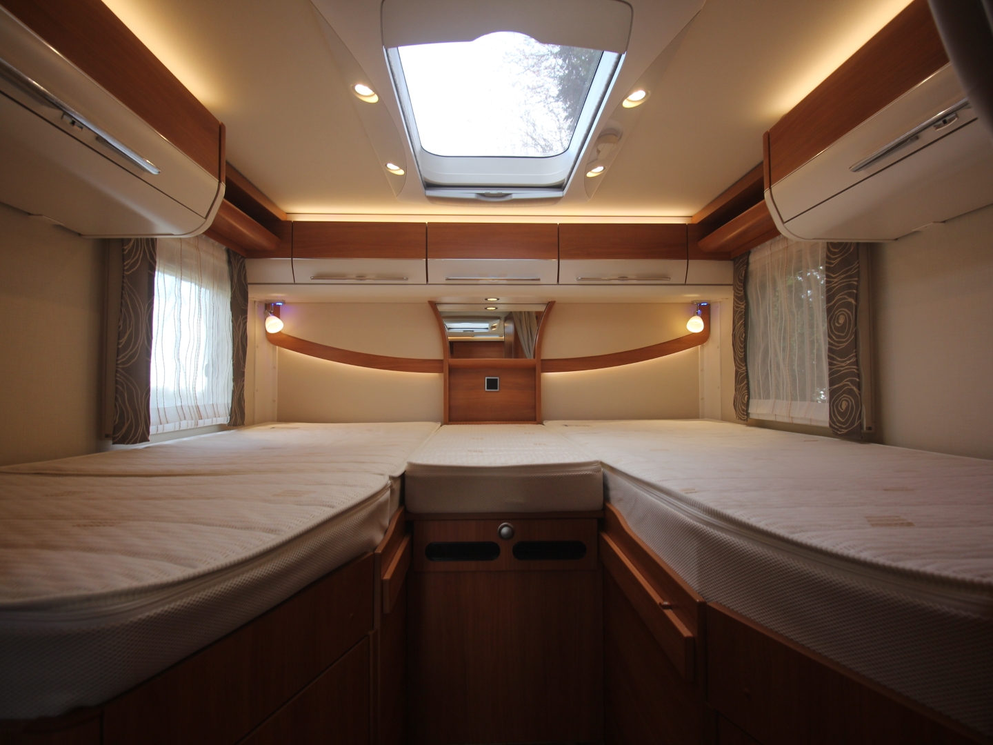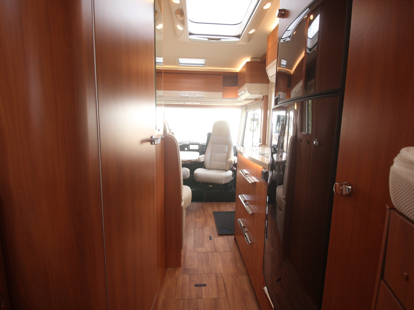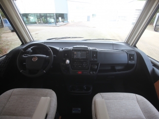 2 comfortabele Aguti Ergoflex pilotenstoelen, in hoogte en helling instelbaar, draaibaar naar een gezellige en ruime comfort L-zit met luxe salontafel. Het interieur is bijzonder ruim doordat er bovenkastjes zijn gemonteerd in plaats van een hefbed. Het heeft een volledig vlakke vloer en bestaat uit het nieuwe lichtbouw-meubelgeneratie en het sierlijke meubeldesign, in combinatie met de luxe Cremissimo bekleding en de vele LED verlichting geeft dit een bijzondere sfeer. Het voorraam is voorzien van elektrisch rolluik en de zijramen van vouw- verduistering van hoogwaardig plisséstof,