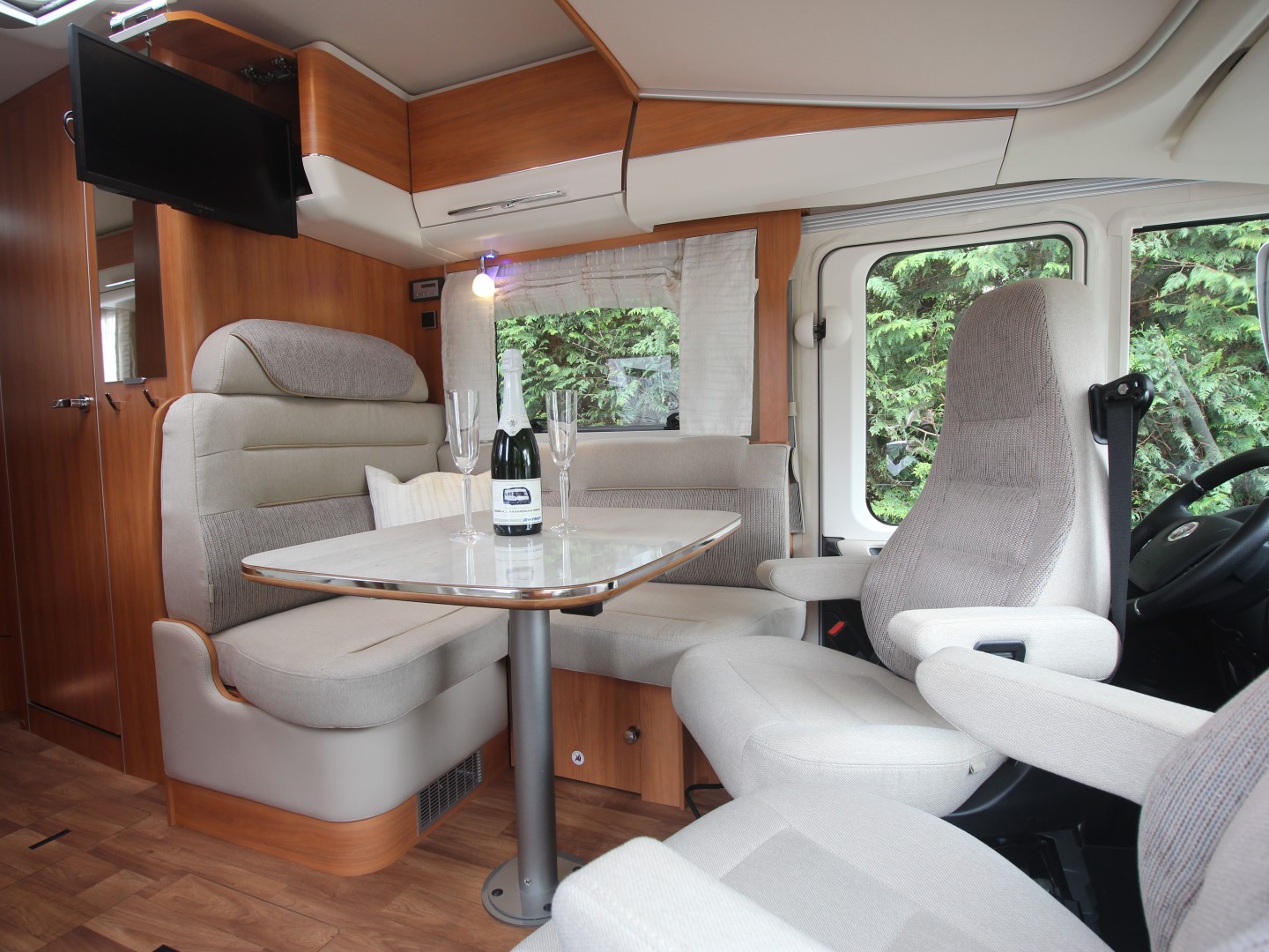 2 comfortabele Aguti Ergoflex pilotenstoelen, in hoogte en helling instelbaar, draaibaar naar een gezellige en ruime comfort L-zit met luxe salontafel. Het interieur heeft een volledig vlakke vloer en bestaat uit het nieuwe lichtbouw-meubelgeneratie en het sierlijke meubeldesign, in combinatie met de luxe Santorin bekleding en de vele LED verlichting geeft dit een bijzondere sfeer. Cabineramen zijn voorzien van vouw- verduistering van hoogwaardig plisséstof.