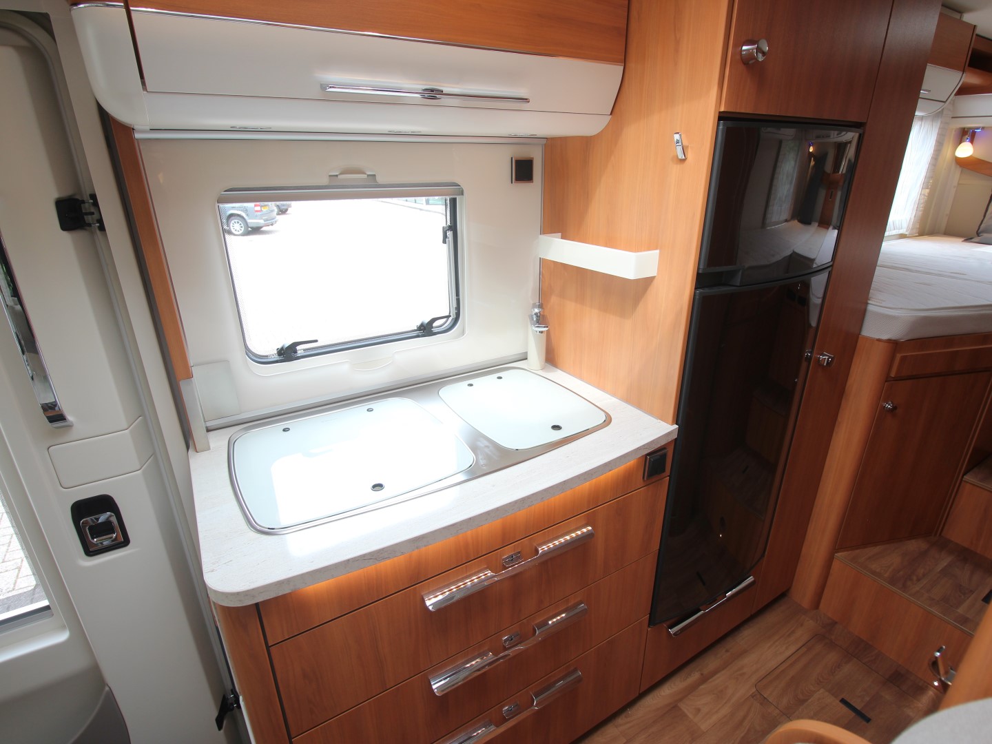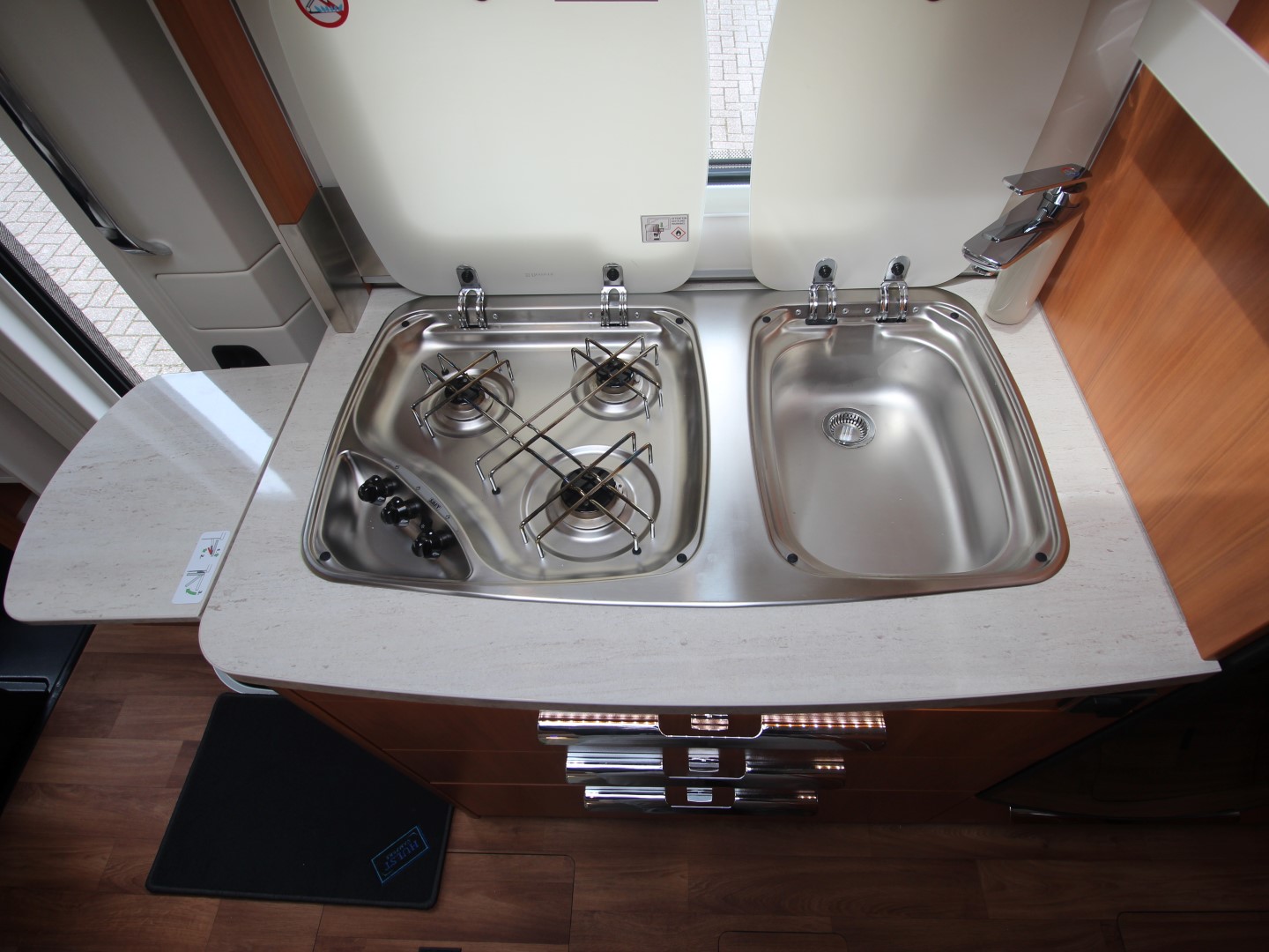 De royale keuken heeft een luxe keukenblad met spoelbak en 3 pits kooktoestel met automatische ontsteking, diverse gelagerde laden met verrassend veel bergruimte voor het kookgerei en boodschappen, grote dubbeldeurs koelkast 150 ltr met aparte vriezer en automatische omschakeling van 220 V/12 V/gas.