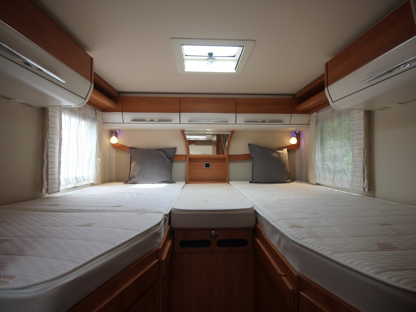 Het slaap gedeelte heeft achter 2 enkele bedden, dicht te leggen tot 1 groot bed, voorzien van het Hymer slaapcomfort systeem wat een weldadige nachtrust garandeerd. Onder de bedden zijn 2 grote (hang) kasten voor kleding ed. Het hefbed bied royaal plaats voor 2 personen.