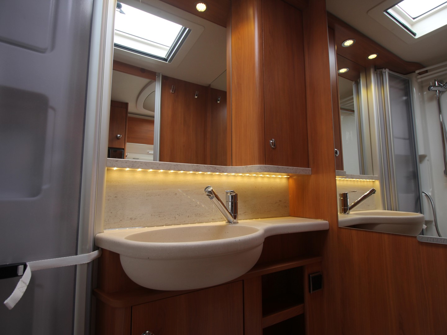 De nieuwe comfortabele badkamer heeft een volledig vlakke vloer en bied voldoende sta- en doucheruimte en is voorzien van wastafel en Thetford banktoilet.