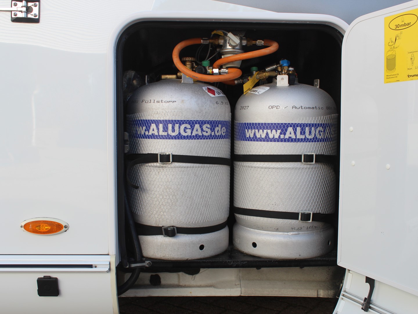 luiken in de vloer. De camper is voorzien van Truma CP Plus verwarming/boiler met thermostatisch bedieningspaneel en het