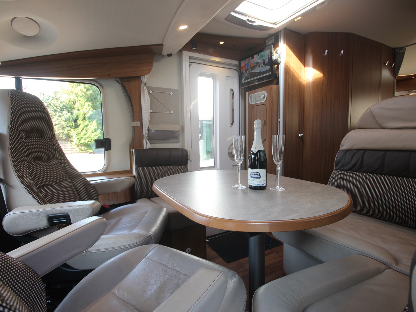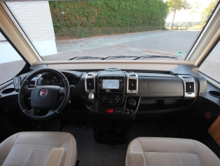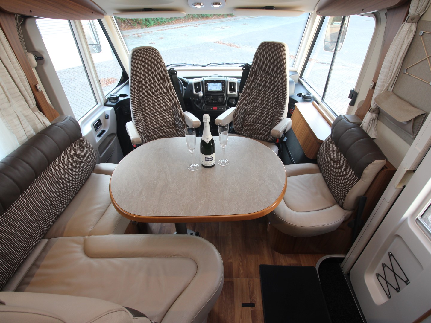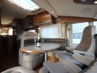 2 comfortabele in hoogte verstelbare Aguti pilotestoelen, draaibaar naar een gezellig comfort L-zit met luxe salontafel, waar u uw visite comfortabel en ruim kunt ontvangen. Het interieur bestaat uit exclusief meubeldecor 'Palatino Apfel' met unieke stijl Premium Line in combinatie met de luxe leder/stofbekleding 'Tobago' waarbij met de vele