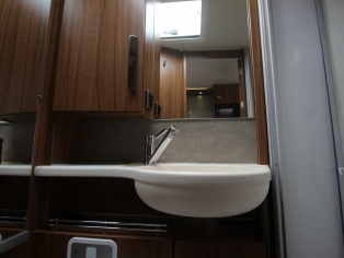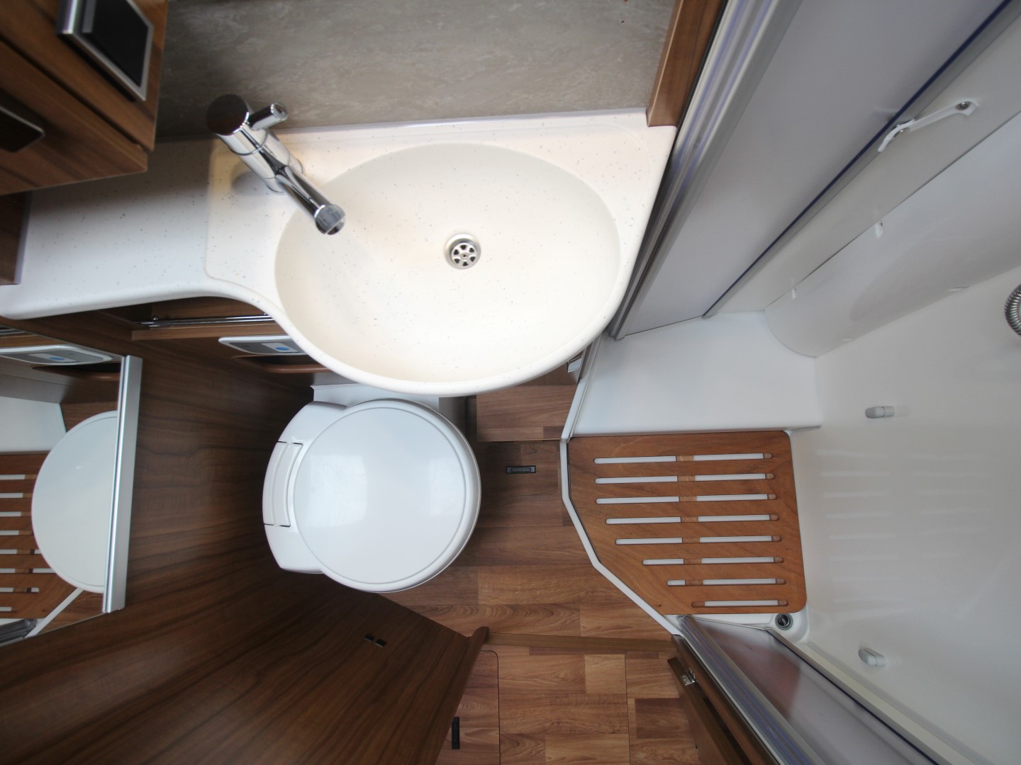 Luxe comfortabele badkamer met wastafel en Thetford toilet met extra kastruimte en ruime aparte douchecabine, SOG automatische toiletontluchting, de 160 ltr schoon - en 140 ltr vuilwatertank bevinden zich in de (verwarmde) dubbele vloer. De fietsen en bagage plaatst u in de grote garage, bereikbaar dmv. een grote deur links en rechts. Het dak is voorzien van het