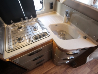 warmtegordijn creëert. De royale hoekkeuken bevat een blad uit mineraalstof, spoelbak en 3 pits kooktoestel, diverse gelagerde laden met verrassend