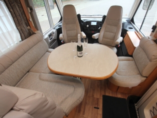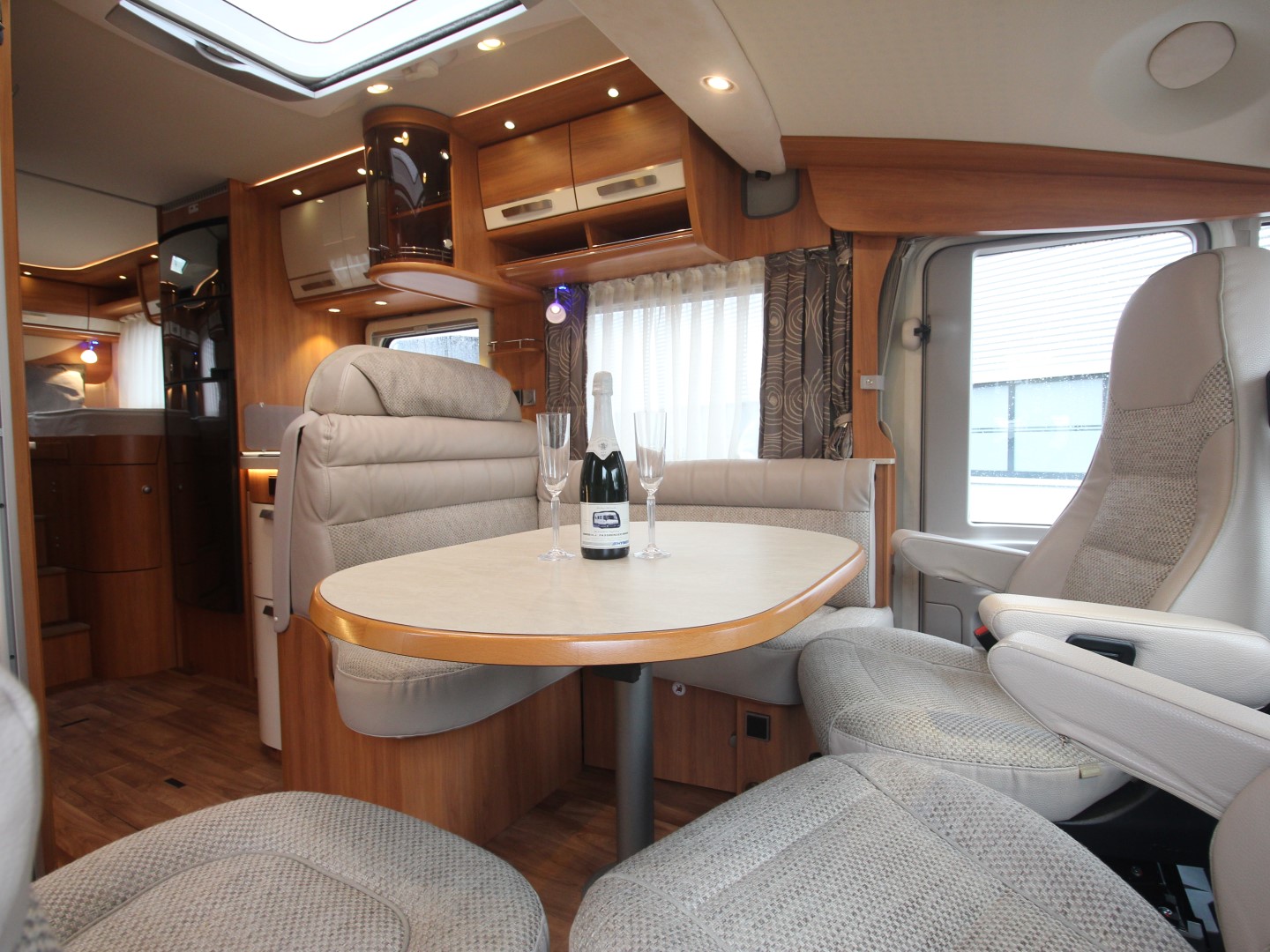 2 comfortabele in hoogte verstelbare Aguti pilotestoelen, draaibaar naar een gezellig comfort L-zit met luxe salontafel. Het interieur bestaat uit sfeervol meubeldecor Trentino Binbaum in combinatie met de luxe leder/stofbekleding waarbij met de vele LED verlichting een bijzondere sfeer ontstaat. De comfort ingangs-deur is voorzien van een raam, schuifbare hor, en electrische opstap.