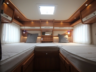 Het slaapgedeelte heeft 2 enkele bedden met het Hymer slaapcomfort systeem met koudschuimmatras op schotelbodem, ( om te leggen naar 1 groot bed) waaronder zich 2 ruime hangkasten bevinden. Boven in de cabine een royaal 2 persoons hefbed. Dit betreft een Hymer B serie en bevat een dubbele bodem met veel extra bergruimte bereikbaar door diverse luiken in de vloer. De camper is voorzien van Truma Combi 6 verwarming/boiler met ringverwarming. De royale hoekkeuken bevat een spoelbak en 3 pits kooktoestel, diverse gelagerde laden met verrassend veel bergruimte voor kookgerei en boodschappen, en grote Dometic koelkast Tec Tower met aparte vriezer en luxe oven.