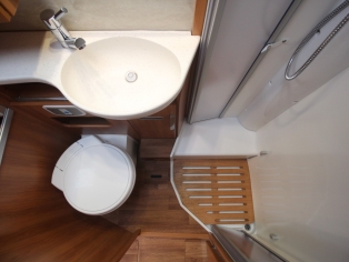 Luxe comfortabele badkamer met wastafel en Thetford toilet met extra kastruimte en ruime aparte douchecabine, SOG automatische toiletontluchting, de schoon - en vuilwatertank bevinden zich in de (verwarmde) dubbele vloer. De fietsen en bagage plaatst u in de grote garage, bereikbaar dmv. een grote deur links en rechts. Het dak is voorzien van het hagelbestendig GFK materiaal.