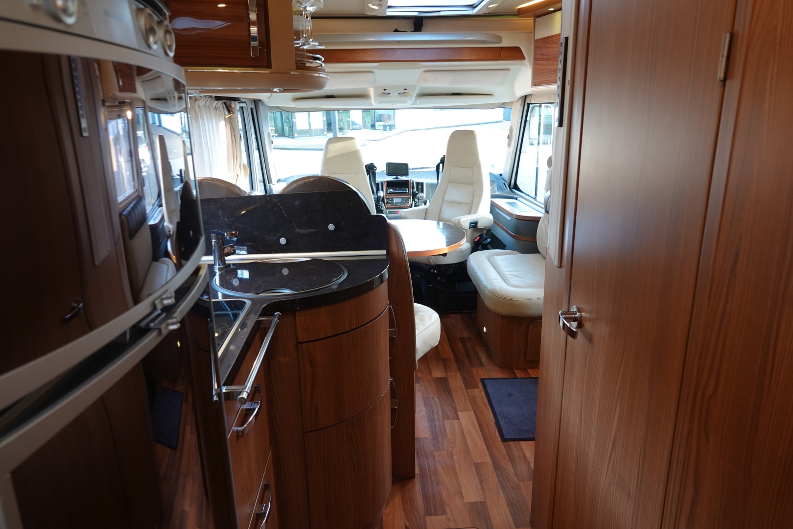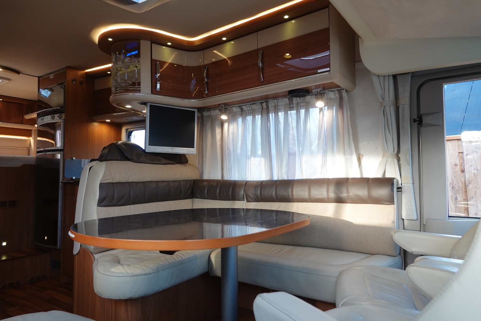 2 comfortabele, met leer beklede Aguti pilotestoelen, in hoogte verstelbaar en kantelbaar, draaibaar naar de bijzonder ruime comfort L-zit met zijbank. Het sfeervolle interieur bestaat uit het Hymer Kirschbaum hout decor in combinatie met luxe Havanna leder/stofbekleding, wat met zijn ambiente sfeerverlichting een bijzonder mooi effect geeft. Alle ramen zijn voorzien van vouw-verduistering van hoogwaardige plisséstof.