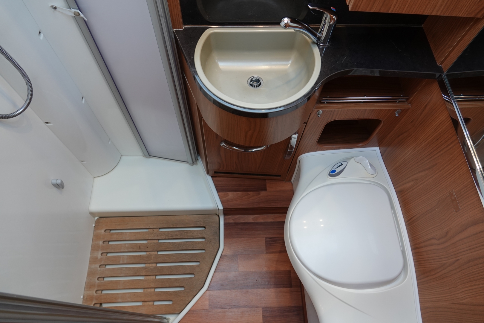 De ruime badkamer met wastafel heeft een Thetford toilet met SOG, extra kastruimte en een aparte grote douchecabine.
