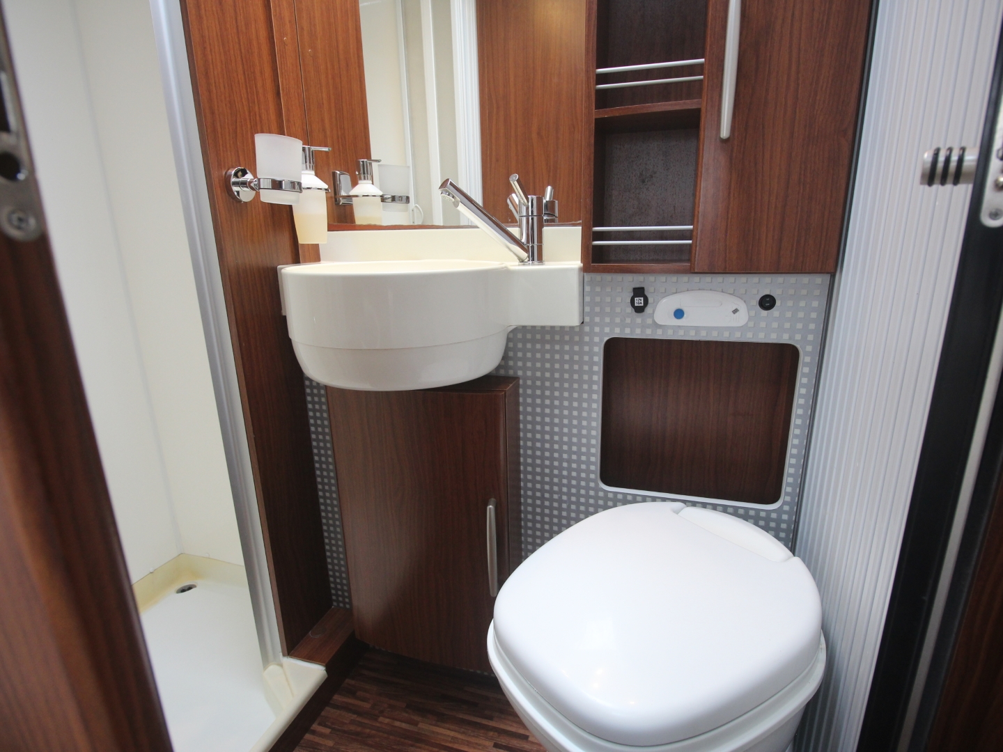 De comfort ingangsdeur is voorzien van een raam, schuifbare hordeur en een elektrisch en geïntegreerde opstap, de royale hoekkeuken bevat een spoelbak en 3 pits kooktoestel met ontstekingsautomaat, afzuigkap, diverse gelagerde laden met verrassend veel bergruimte voor het kookgerei en boodschappen, grote Dometic Tec Tower dubbeldeurs koelkast 160 ltr met aparte vriezer en volautomatische omschakeling van 220 Volt / 12 Volt / gas, inclusief een bakoven.
