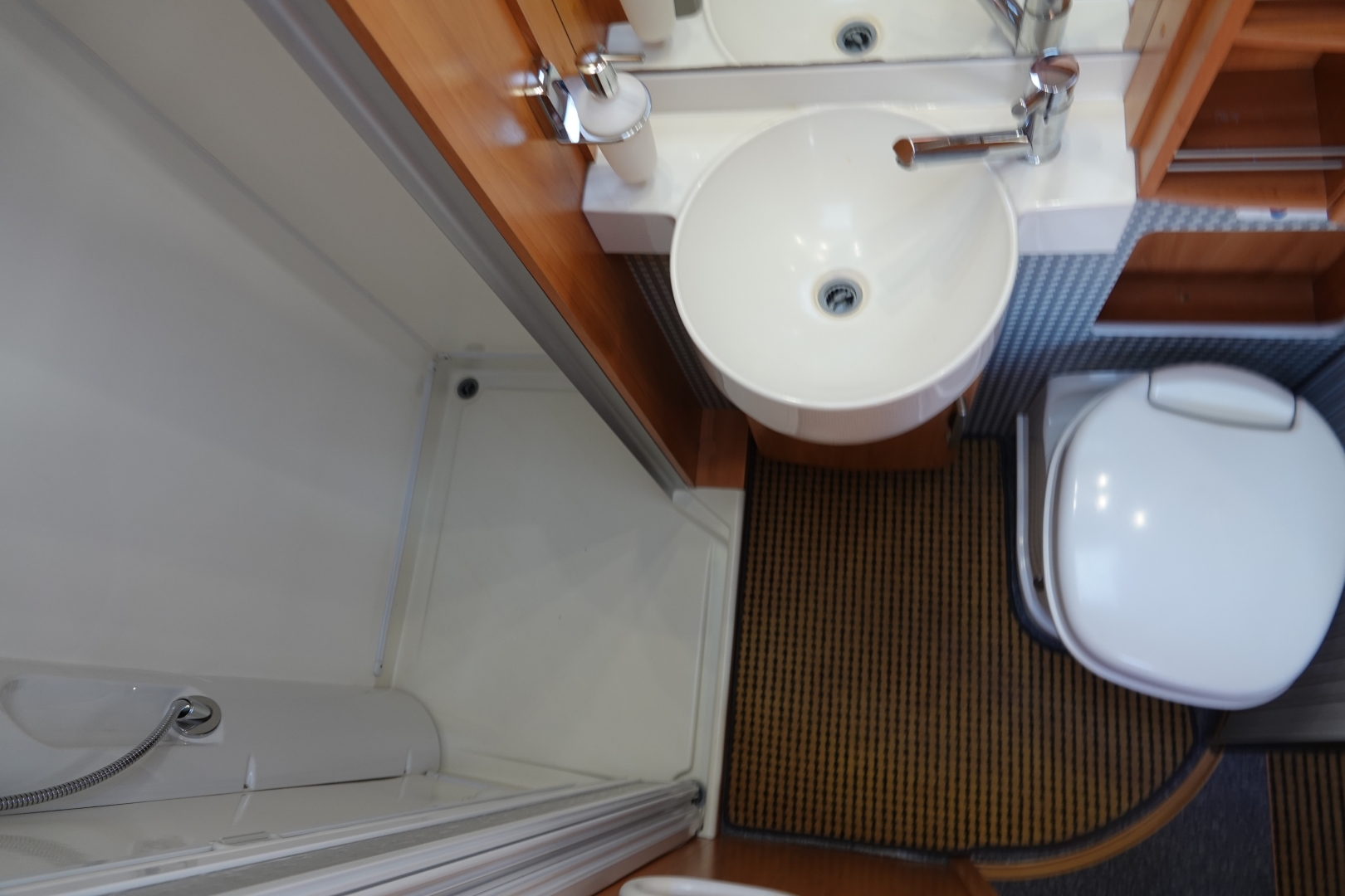 De ruime badkamer met wastafel heeft een Thetford toilet met extra kastruimte, en een grote douchecabine.