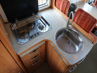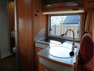 De royale hoekkeuken heeft een luxe keukenblad met spoelbak en 3 pits kooktoestel met automatische ontsteking en diverse gelagerde laden met verrassend veel bergruimte voor het kookgerei en boodschappen, met grote Dometic koelkast met aparte vriezer, oven en automatische energiekeuze.