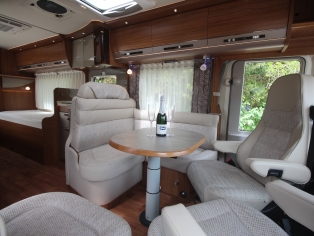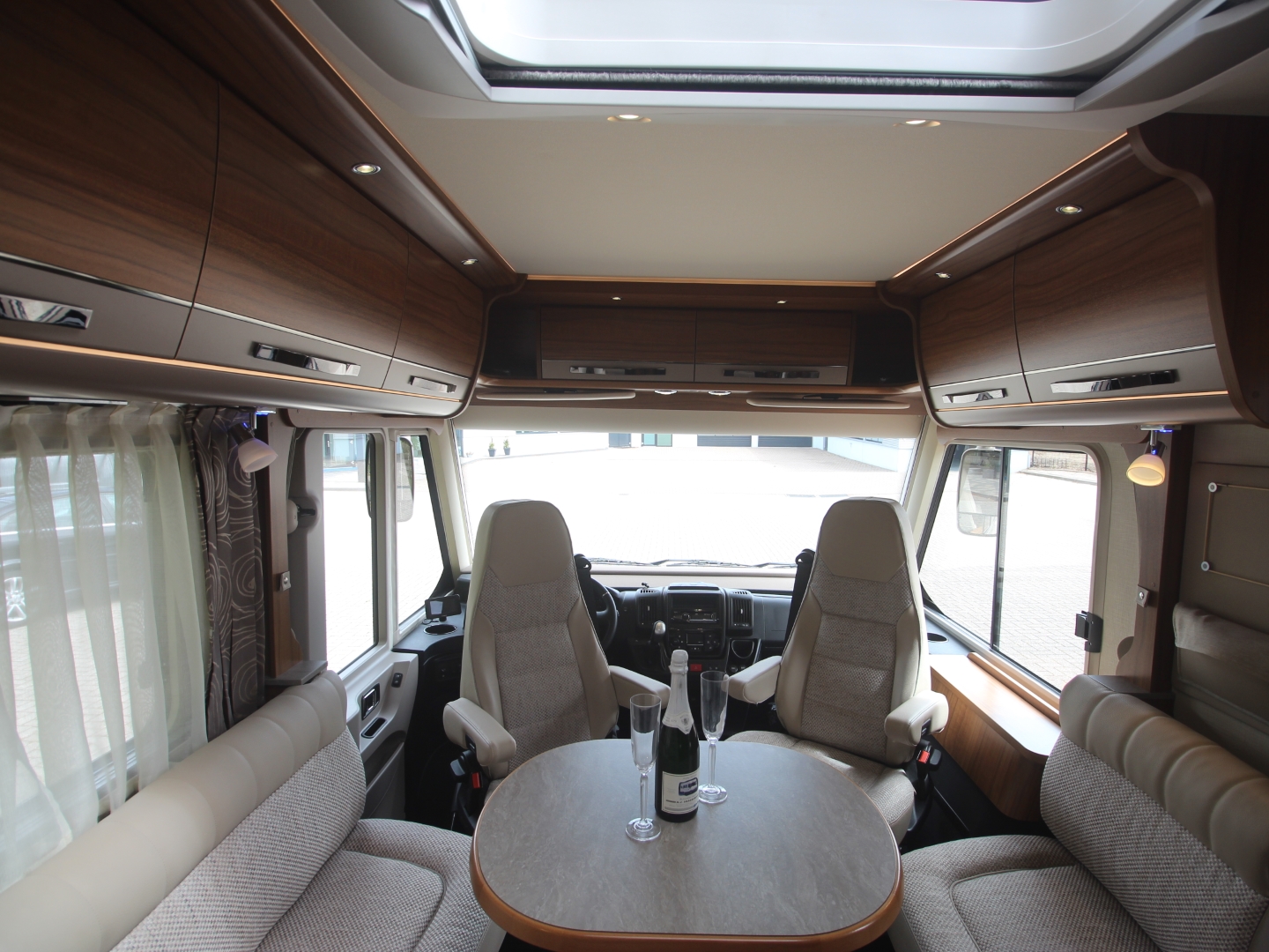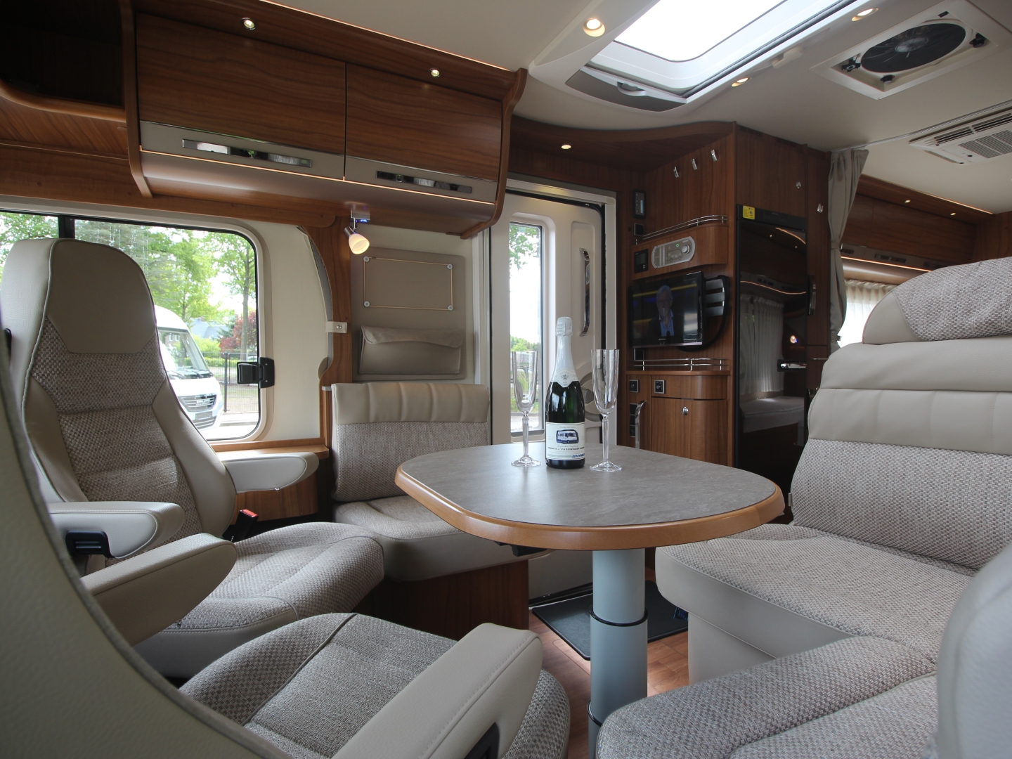 2 comfortabele Aguti Ergoflex pilotenstoelen in hoogte verstelbaar en kantelbaar, draaibaar naar een gezellige comfort L-zit met een luxe salontafel. Van de zitgroep is eenvoudig een extra slaapplaats te maken. Het interieur bestaat uit unieke Hymer 'Palatino Apfel' meubilair met de luxe 'Cremmisimo' leer/stofbekleding, wat met de vele LED verlichting een bijzondere sfeer geeft. Schitterende bovenkastjes in cabine waar u rechtop kunt staan. Alle ramen zijn voorzien van plisséverduistering van hoogwaardige plisséstof, terwijl het voorraam word verduisterd dmv. een electrisch rolluik.