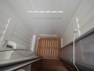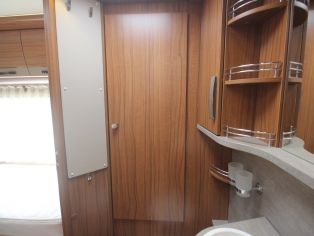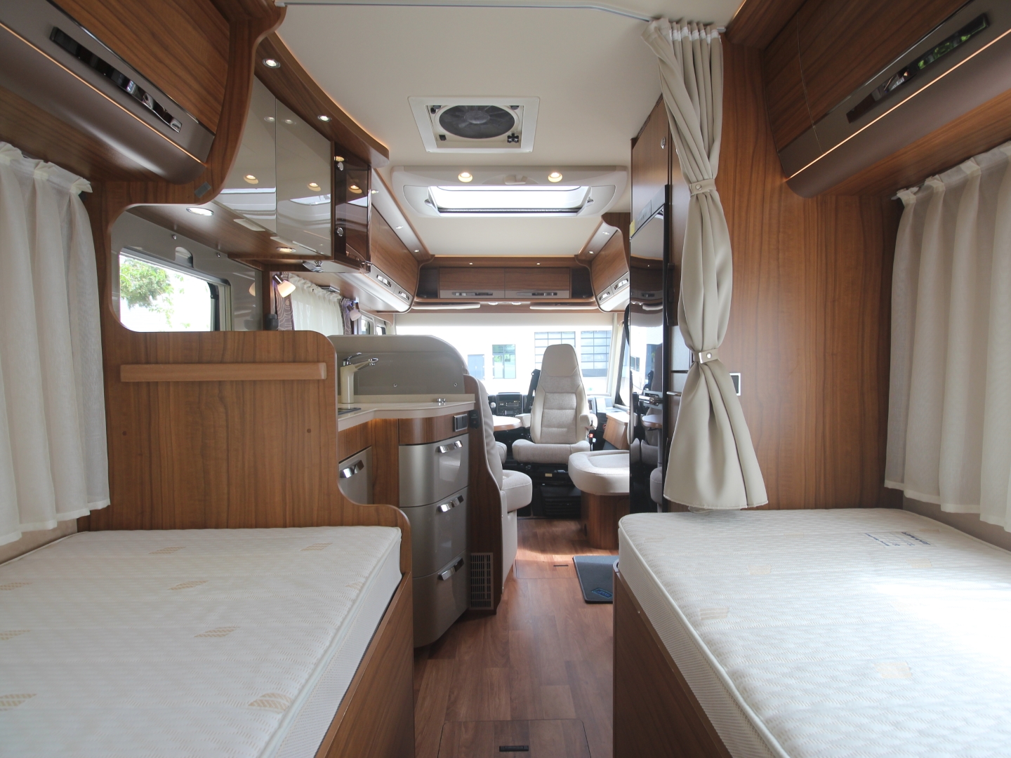 Achterin bevinden zich twee lage, makkelijk toegankelijke eenpersoonsbedden met enorme bergruimte eronder. De Dometic dakairco zorgt voor koele nachten. De ruime badkamer bevind zich helemaal achterin, met een royale hangkast, Thetford toilet met SOG en aparte ruime douchecabine.