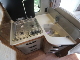 De royale hoekkeuken heeft een luxe keukenblad met spoelbak en 3 pits kooktoestel met automatische ontsteking, electrische dakventilator erboven, diverse gelagerde laden met servo softsluiting, en verrassend veel bergruimte voor het kookgerei en boodschappen, grote Dometic koelkast 150 ltr met aparte vriezer en automatische energiekeuze.